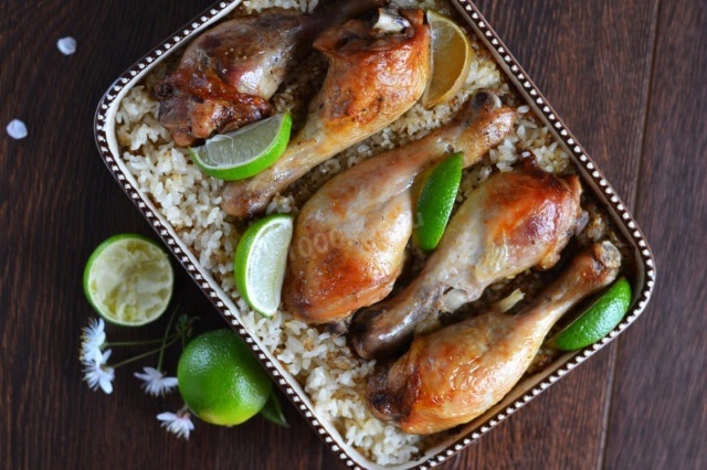 3. В форму для запекания налить растительное масло, выложить рис и залить горячей водой, чтобы она полностью покрывала крупу. Уложить маринованные голени сверху и полить остатками маринада. По желанию добавить дольки лайма для усиления цитрусового аромата.