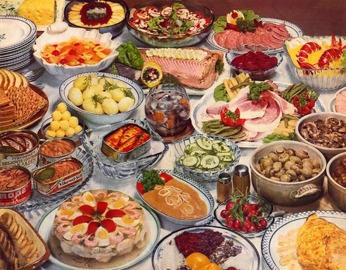 Не менее популярными в советских домах были салаты, такие как Винегрет, Оливье и Селедка под шубой. Интересно, что для закусок использовали фаршированные яйца, которые выглядели как «мухоморы», окрашенные красным - это был хит на любом празднике. Отварной язык с чесноком и майонезом, пандемия колбасных и сырных нарезок, а также факультативный холодец были обязательными на каждом столе.