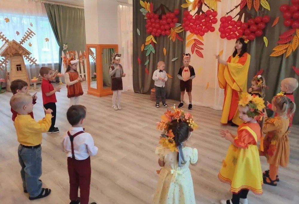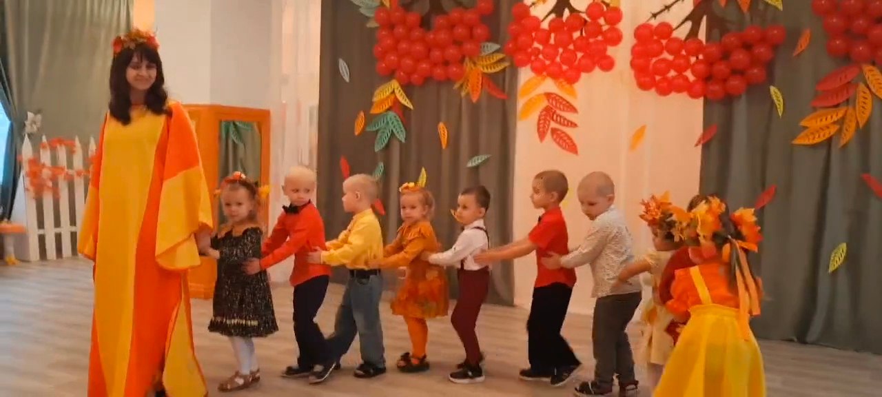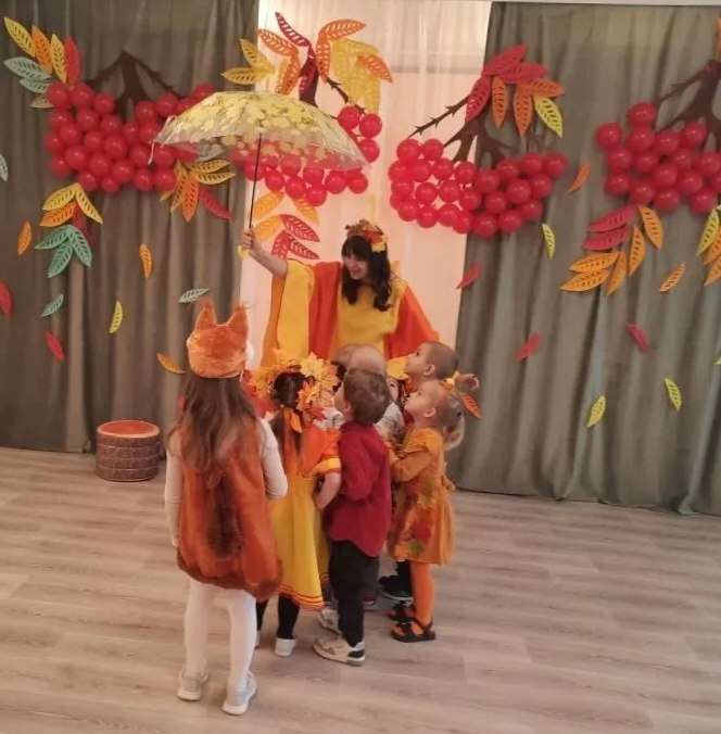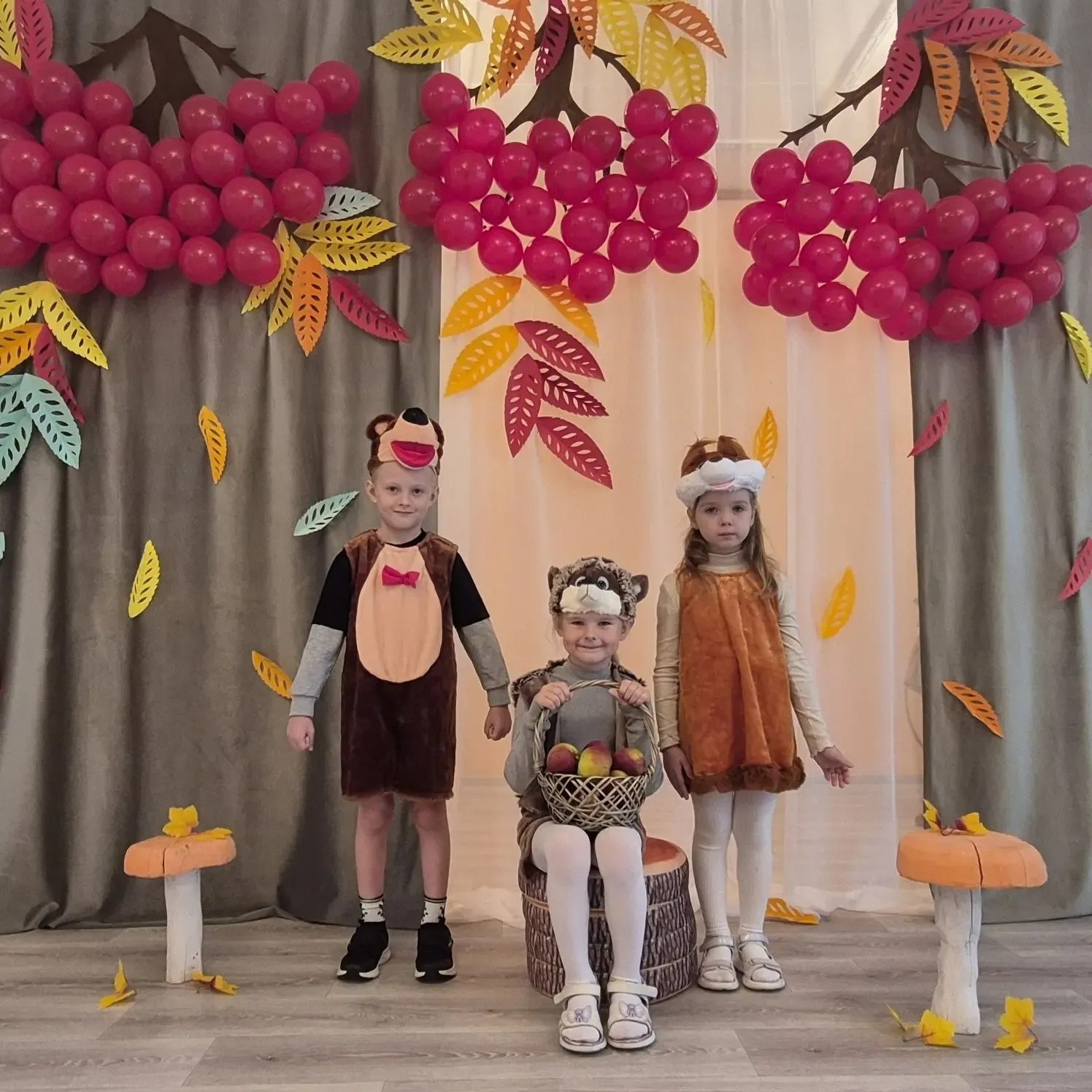 Вместе они отправились на сказочном поезде в волшебный осенний лес, где встретились с Белочкой, Ёжиком и Мишкой. Вместе с ребятами они пели песни, танцевали, играли. Вернувшись обратно, дошколята заметили гостинец от лесных жителей – корзинку с наливными сладкими яблоками.