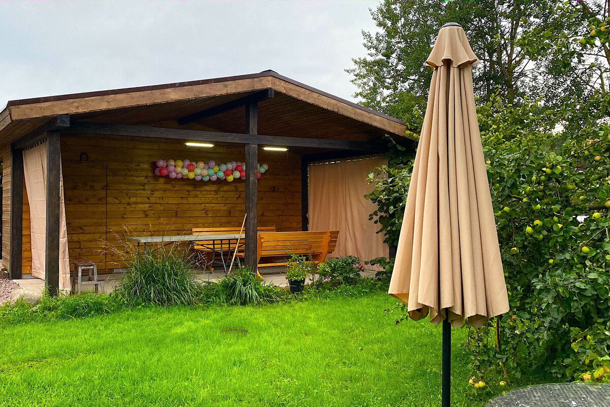 Установленные мужем столы и скамейки создавали уютную атмосферу для празднования. Но буквально за час до встречи с приглашенными небо вдруг затянули тучи. Порывы сильного ветра и дождь буквально обрушились на подготовку, создав дополнительные трудности при переезде блюд из дома в гараж, ведь у всех были новенькие прически и макияжи. Муж предложил использовать зонт, чтобы спасти ситуацию.