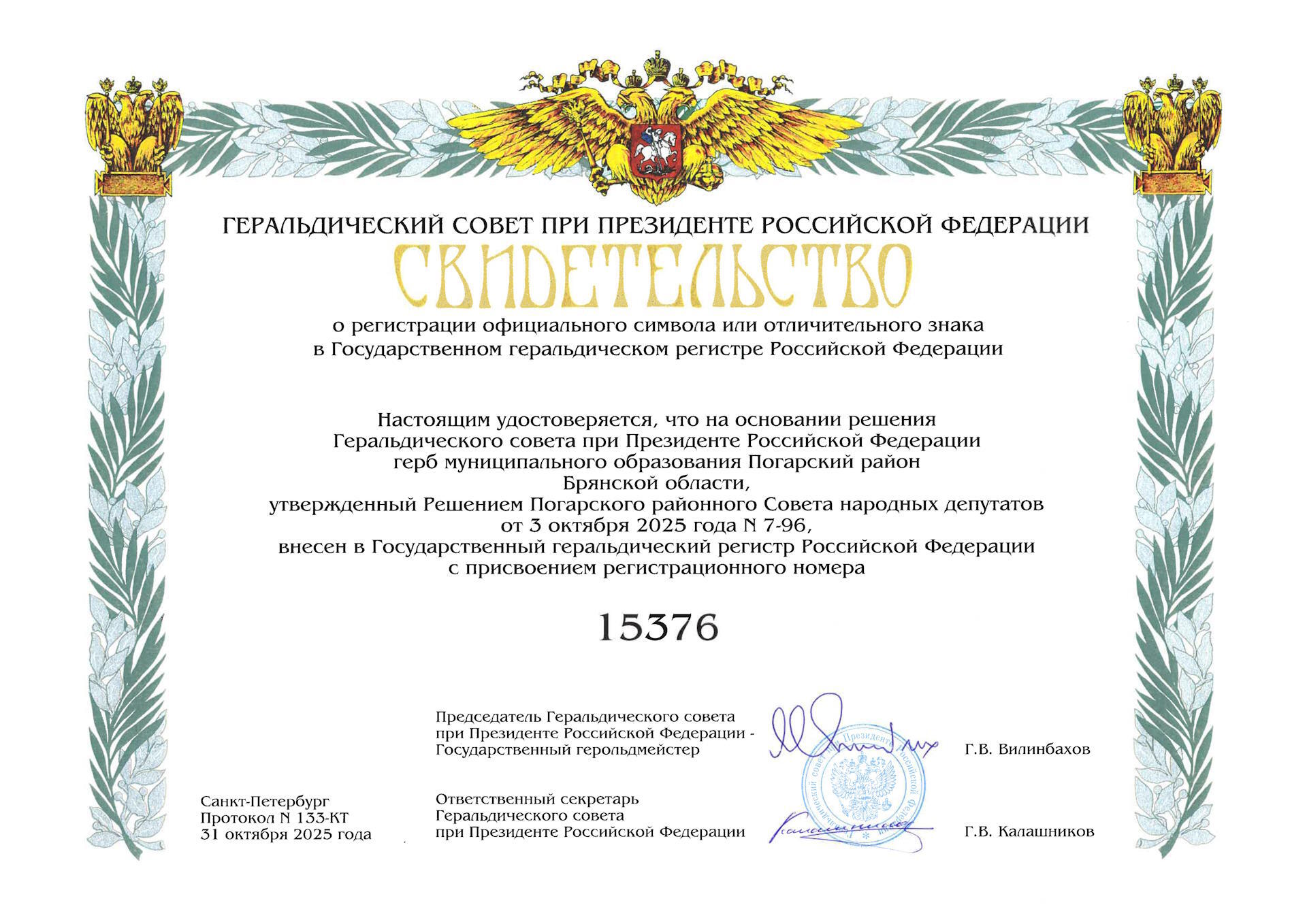 Решением Геральдического Совета при Президенте Российской Федерации (Протокол № 133-КТ от 31 октября 2025 года) зарегистрированы на федеральном уровне и внесены в Государственный геральдический регистр Российской Федерации официальные символы (герб и флаг) Погарского муниципального района Брянской области.