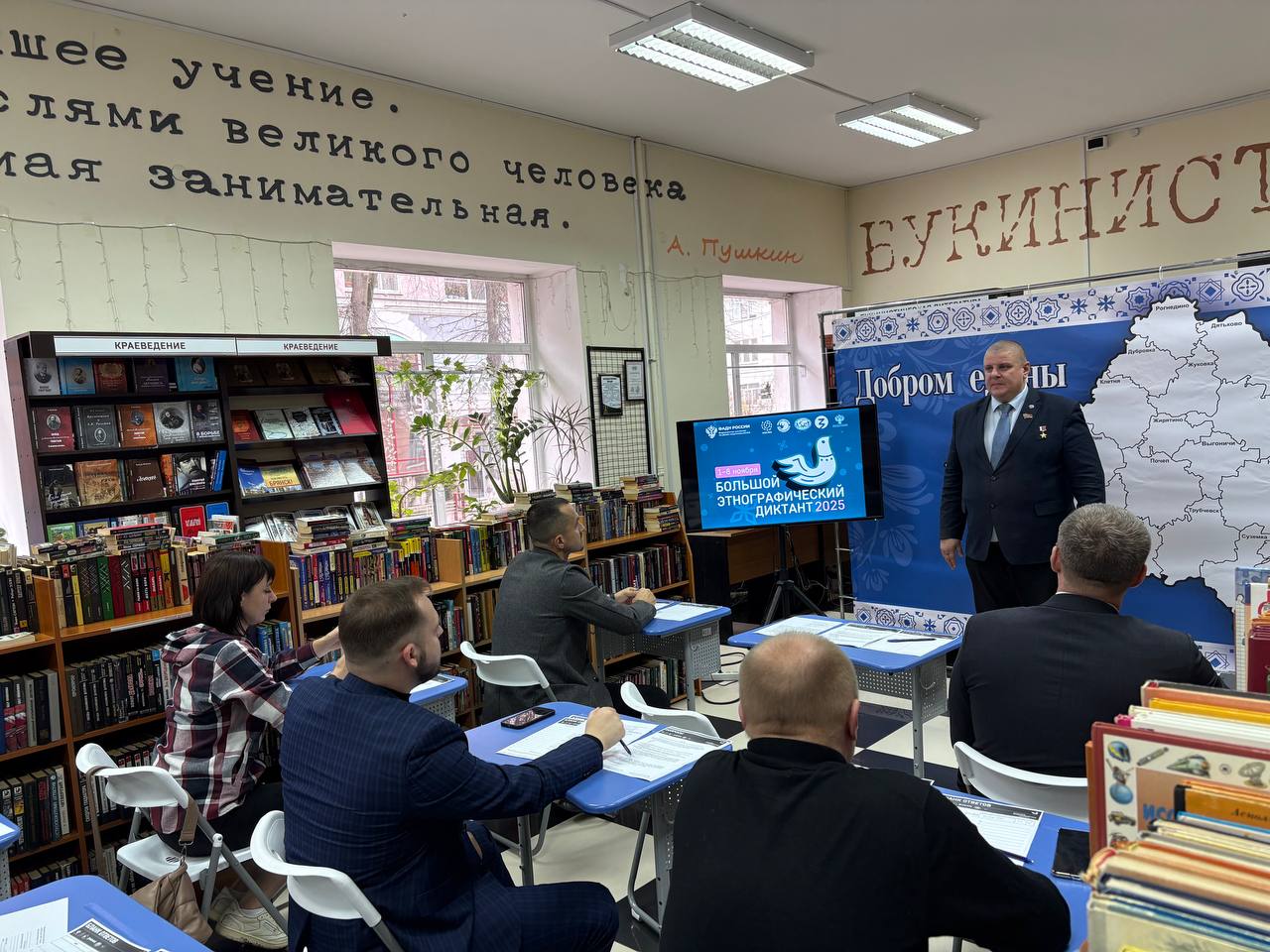 Одной из площадок стал старейший и самый интеллигентный магазин «Брянсккнига» - подразделение ГАУ «Брянский объединенный ресурс». Сегодня здесь диктант написали волонтеры, активисты молодежных организаций, общественники и почетные гости.