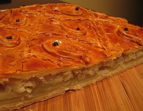 Когда тесто подошло, его необходимо обмять и оставить подойти еще раз, после чего делится на две части: 1/3 и 2/3. Крупная часть раскатывается в пласт размером 25 на 30 см. В начале выкладывается слой тонко нарезанной картошки, затем слой рыбного филе, лука и кусочки сливочного масла. Каждый слой следует приправить солью, перцем и немного тертым мускатным орехом для аромата.