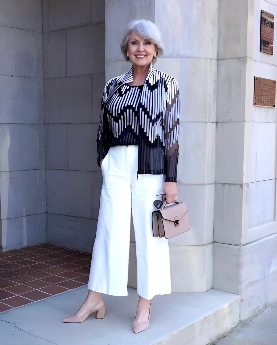 - Широкие белоснежные брюки: Длина до щиколоток в сочетании с темным верхом, как блузка и полупрозрачная рубашка в черно-серо-белом принте, создают утонченный и привлекательный образ. Заправленная блузка акцентирует на талии, а рубашка скрывает возрастные изменения в области шеи и рук.