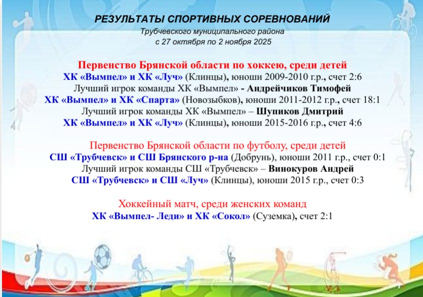 РЕЗУЛЬТАТЫ СПОРТИВНЫХ СОРЕВНОВАНИЙ Трубчевского муниципального района с 27 октября по 2 ноября 2025