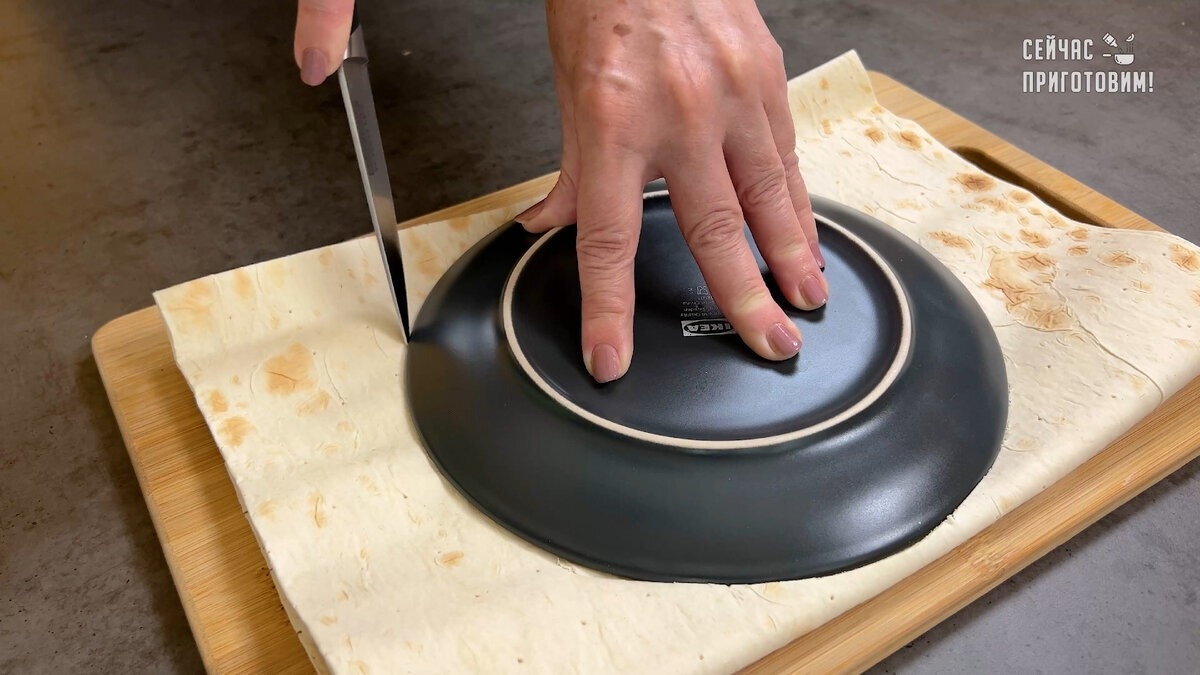 Из лаваша вырезаются два круга. На сухую сковороду кладется первый круг лаваша.