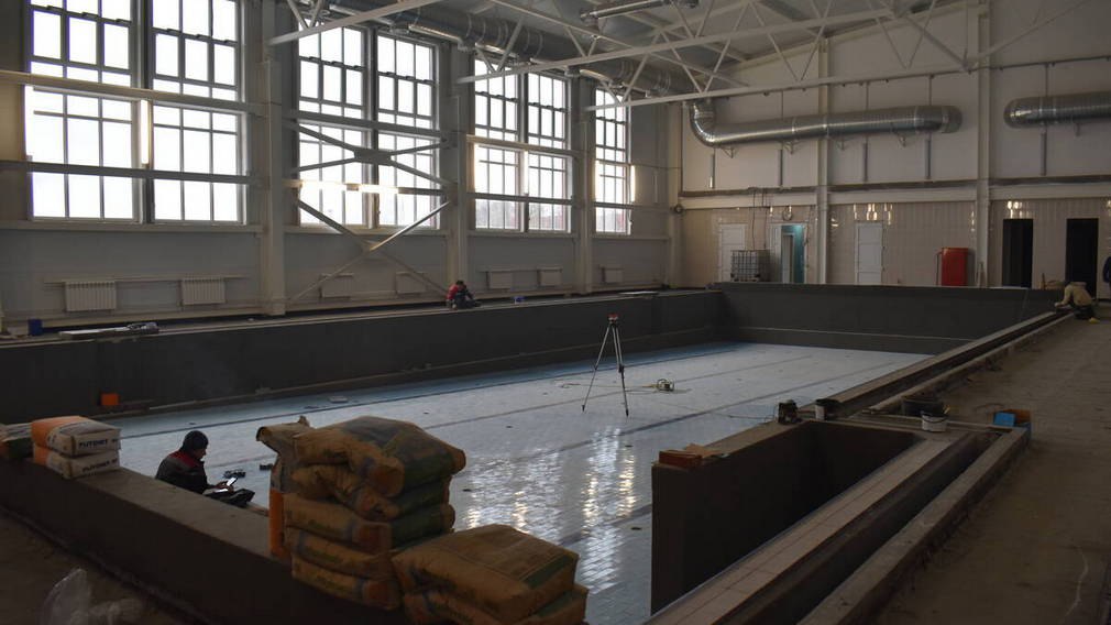 В спортивном зале площадью 1200 квадратных метров на каркас с амортизирующей прослойкой установлена фанера. Поверх нее будет уложен специальный паркет с разметкой для командных видов спорта, таких как волейбол, баскетбол и мини-футбол. В зоне бассейна отделочники заканчивают облицовку стен бассейна плиткой.