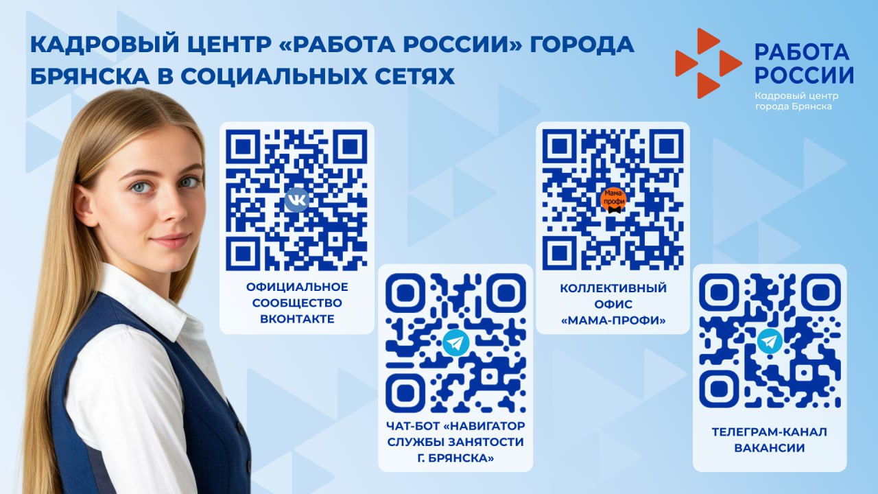 Кадровый центр ведет официальную страницу в социальной сети ВКонтакте по адресу: https://vk.com/czn32br, где публикуется актуальная информация о планируемых мероприятиях, востребованных вакансиях, мерах государственной поддержки и новых сервисах.