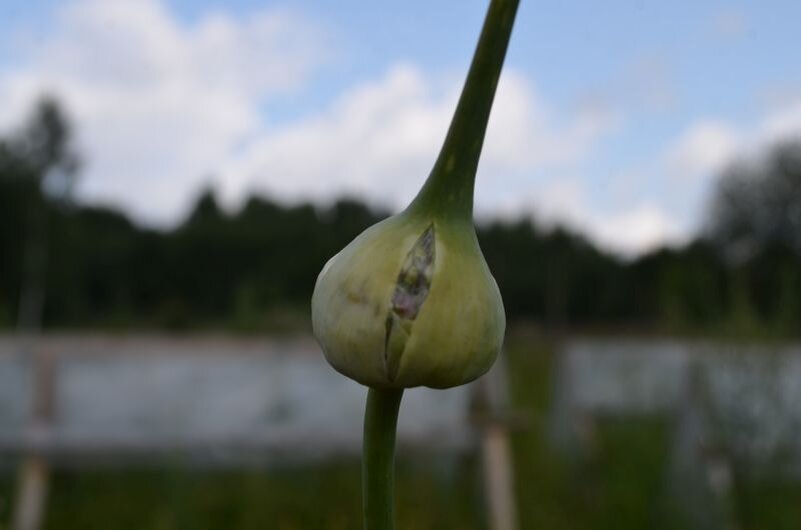 Когда ложный стебель чеснока увядает, это еще один важный признак зрелости. В это время необходимо внимательно осмотреть луковицы: если чешуя тонкая и сухая, чеснок можно выкапывать. Этот момент крайне важен, так как правильно собранные луковицы будут лучше храниться и не испортятся до зимы.