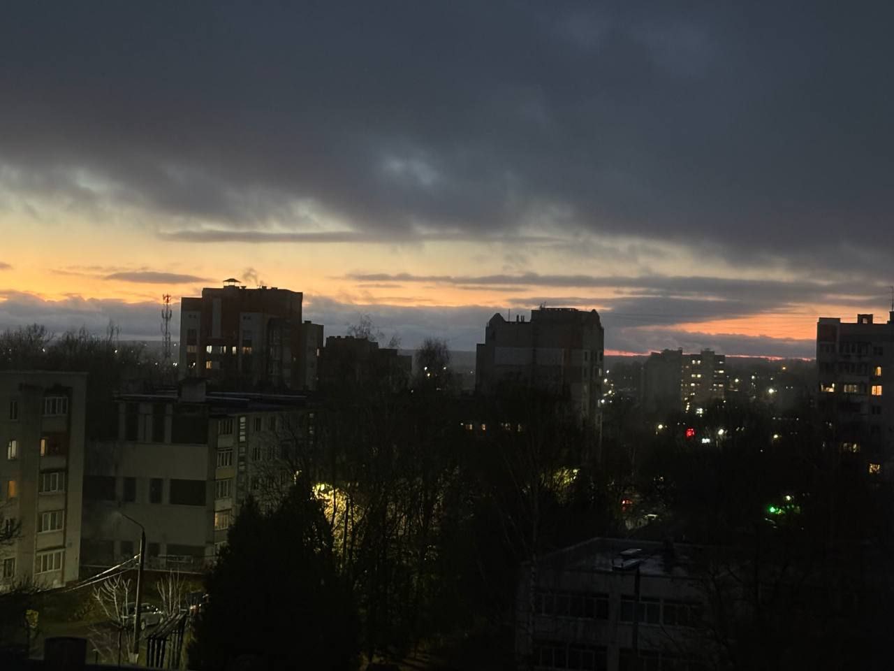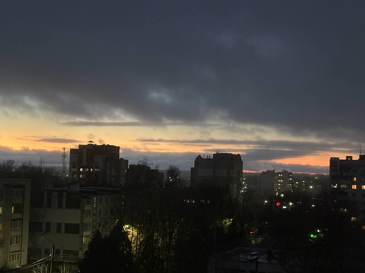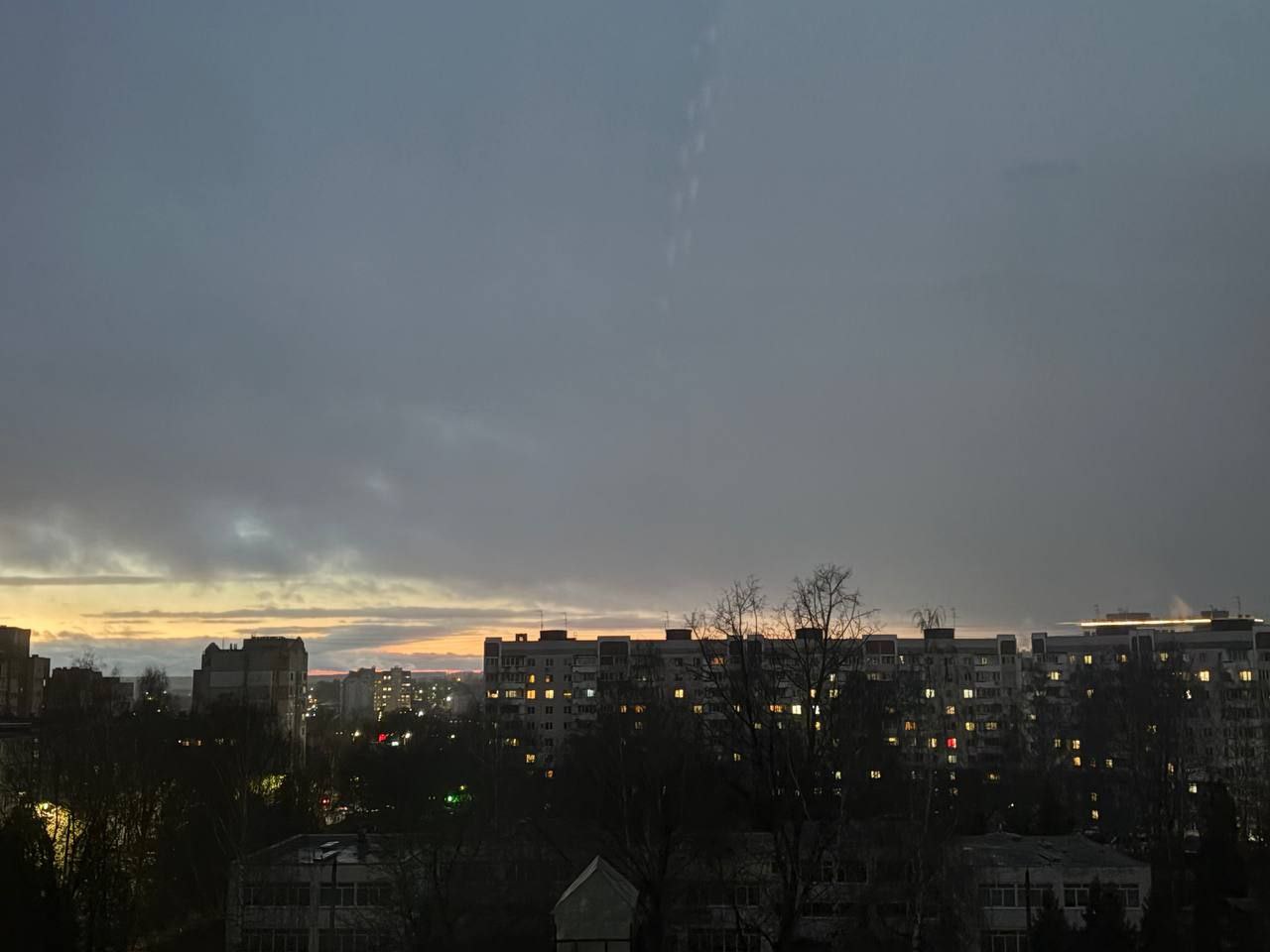 Драматический золотисто-серый закат в первый снежный день ноября.