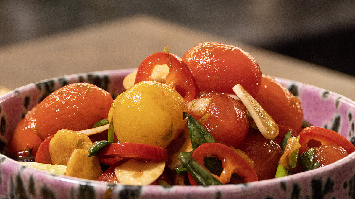 Первым шагом перетереть сладкие томаты черри с помощью газовой горелки для удаления кожицы. Этот трюк не только придаст им особый шарм, но и позволит раскрыть их нежный вкус.