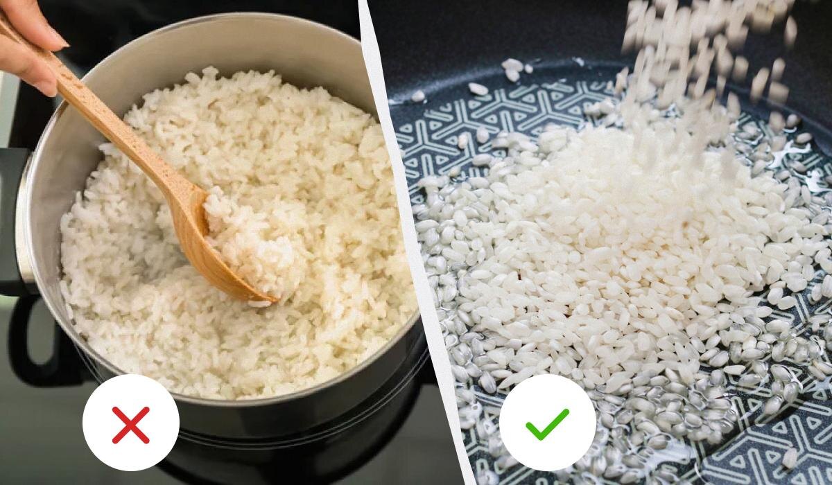 Перед тем, как приступить к жарке, необходимо тщательно промыть рис несколько раз, чтобы удалить лишний крахмал. Затем зерна следует откинуть на дуршлаг и дождаться, пока лишняя вода стечет.