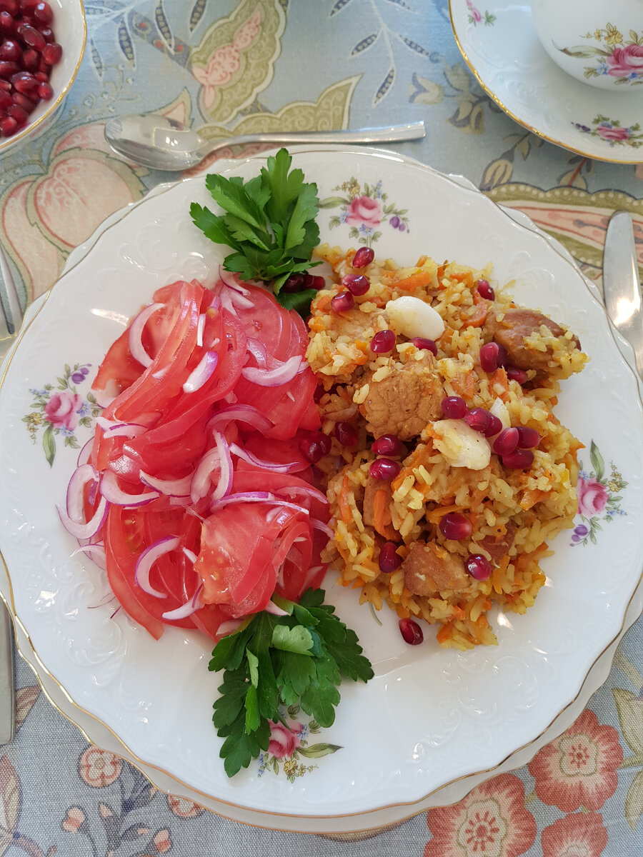 Не забудьте для подачи нарезать салат из томатов и лука, а горячий плов посыпать свежими гранатовыми зёрнами. Это придаст блюду не только яркий цвет, но и неповторимый вкус. Угощайтесь и делитесь своими секретами приготовления плова!