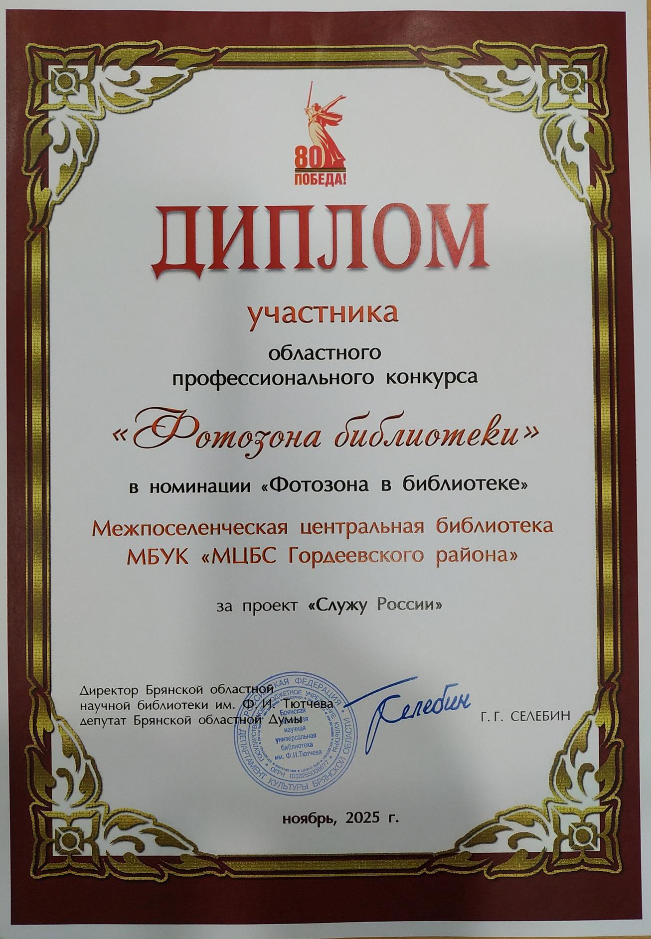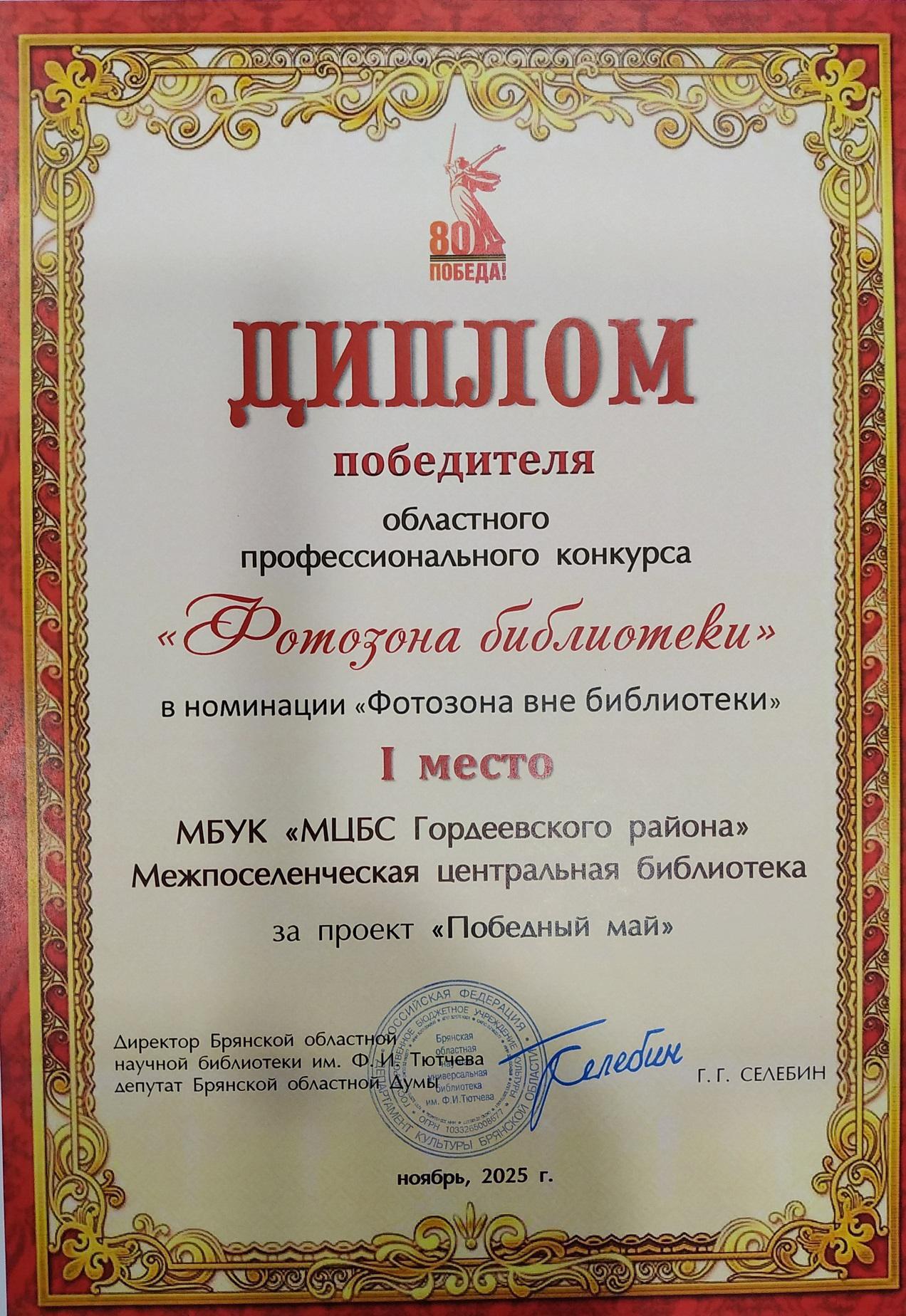 Гордеевская центральная библиотека была отмечена дипломом участника в номинации "Фотозона в библиотеке" за проект "Служу России", также авторство которого принадлежит Рословец Т. Кроме того, эта библиотека получила первое место в номинации "Фотозона вне библиотеки" за проект "Победный май".