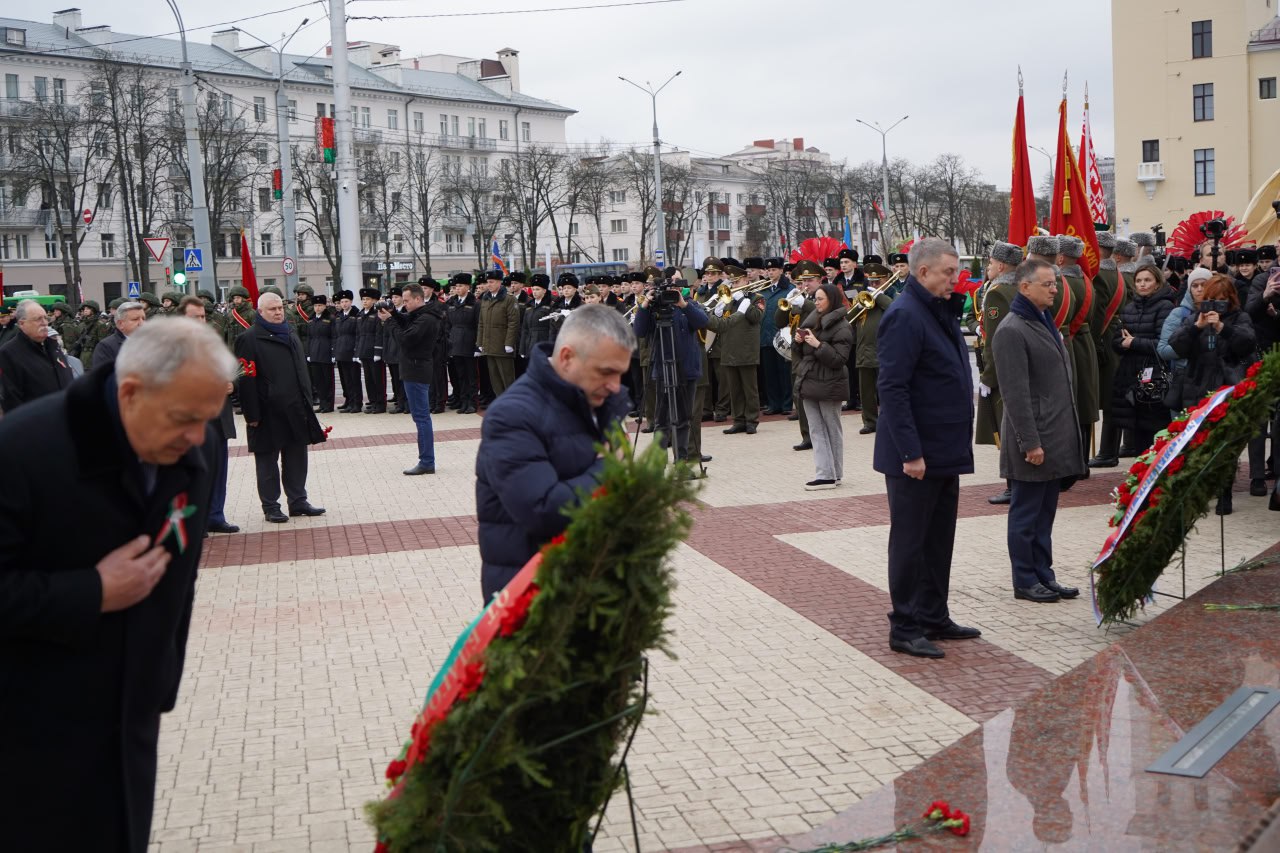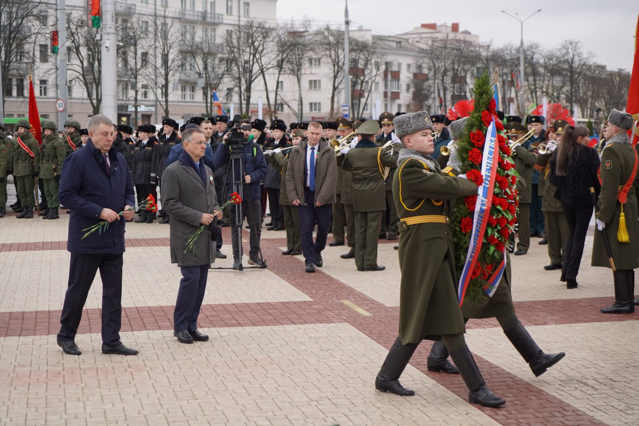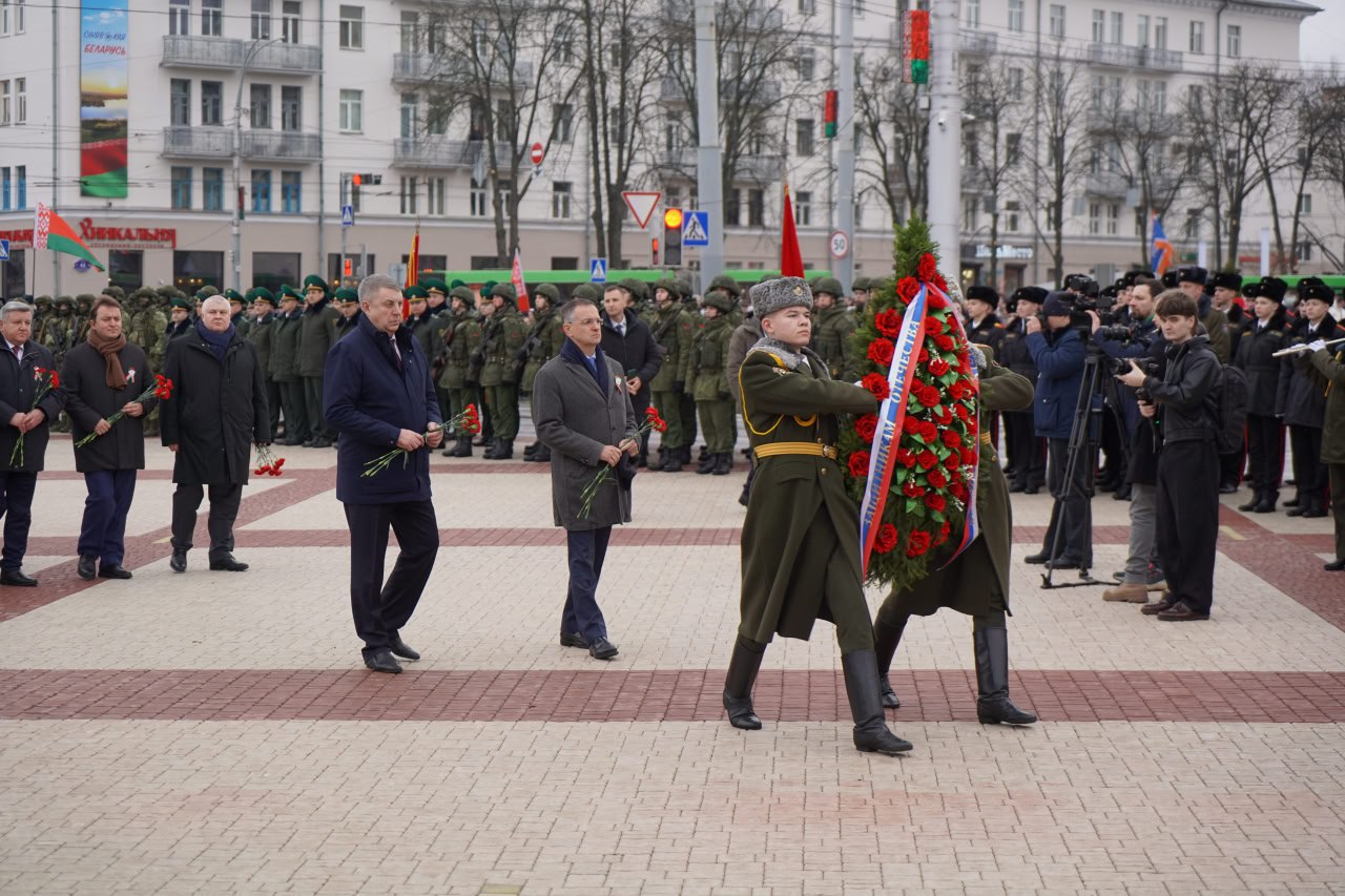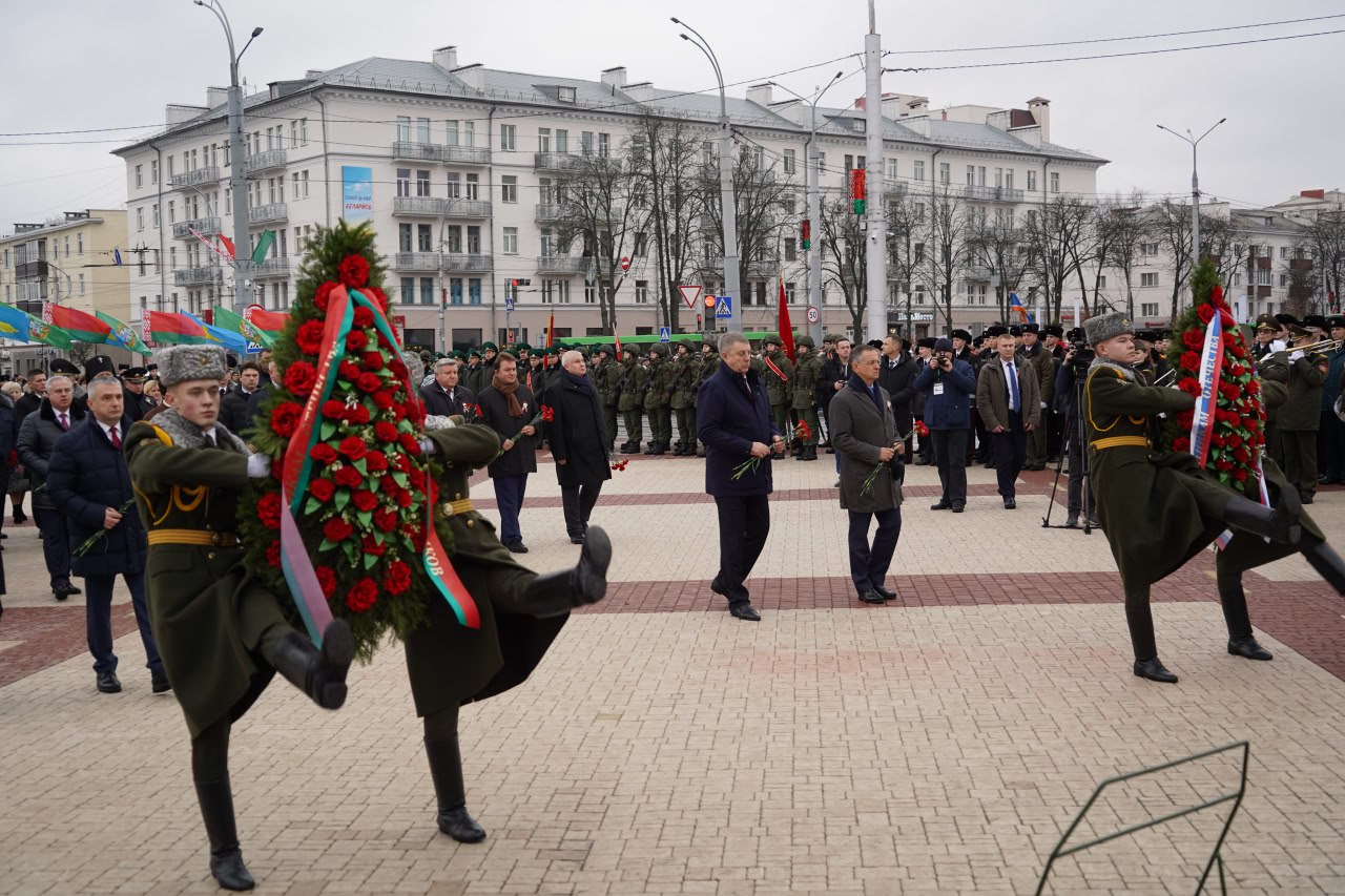С помощником Президента Российской Федерации Владимиром Ростиславовичем Мединским, заместителем начальника Управления Президента России по государственной политике в гуманитарной сфере, заместителем председателя Российского военно-исторического общества Николаем Павловичем Овсиенко, председателем Палаты представителей Национального собрания Республики Беларусь Игорем Петровичем Сергеенко, Председателем Гомельского облисполкома Иваном Ивановичем Крупко, внуком маршала Советского Союза Константина Константиновича Рокоссовского Константином Вильевичем Рокоссовским возложили венки и цветы на площади Восстания.