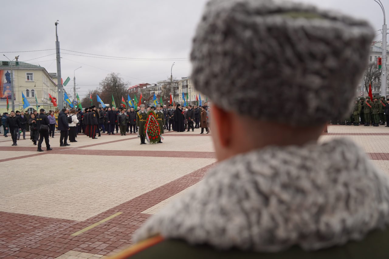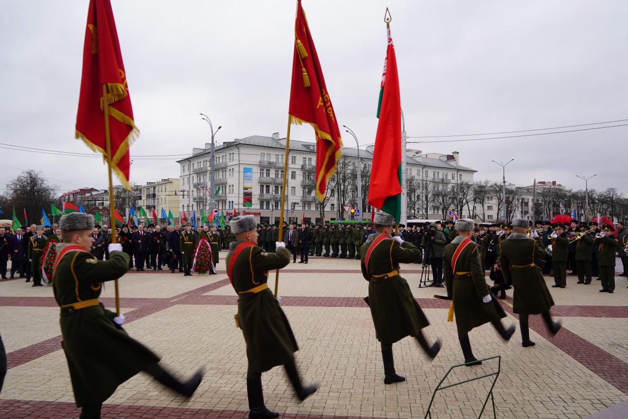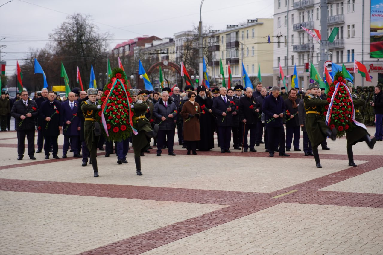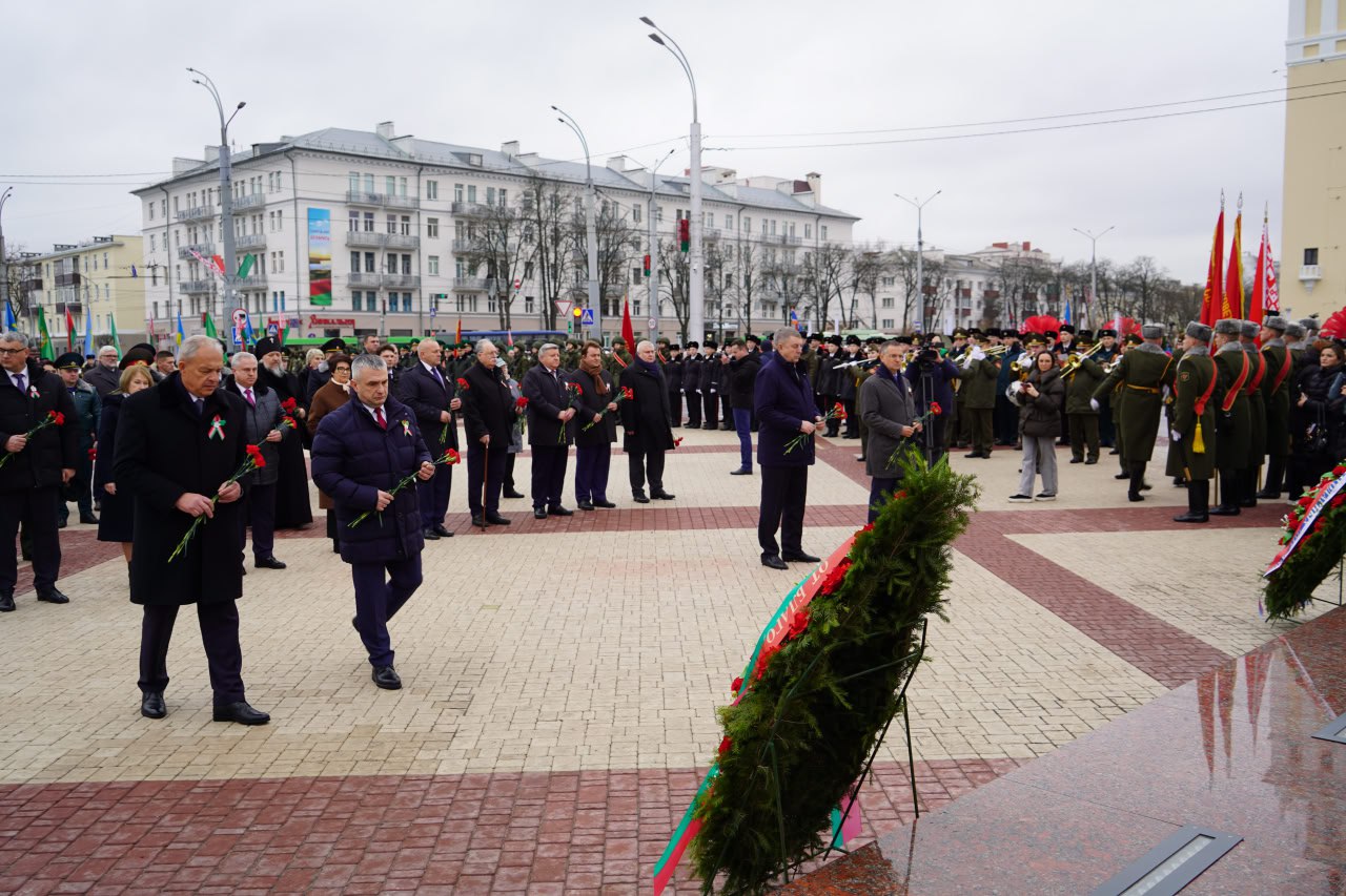 С помощником Президента Российской Федерации Владимиром Ростиславовичем Мединским, заместителем начальника Управления Президента России по государственной политике в гуманитарной сфере, заместителем председателя Российского военно-исторического общества Николаем Павловичем Овсиенко, председателем Палаты представителей Национального собрания Республики Беларусь Игорем Петровичем Сергеенко, Председателем Гомельского облисполкома Иваном Ивановичем Крупко, внуком маршала Советского Союза Константина Константиновича Рокоссовского Константином Вильевичем Рокоссовским возложили венки и цветы на площади Восстания.