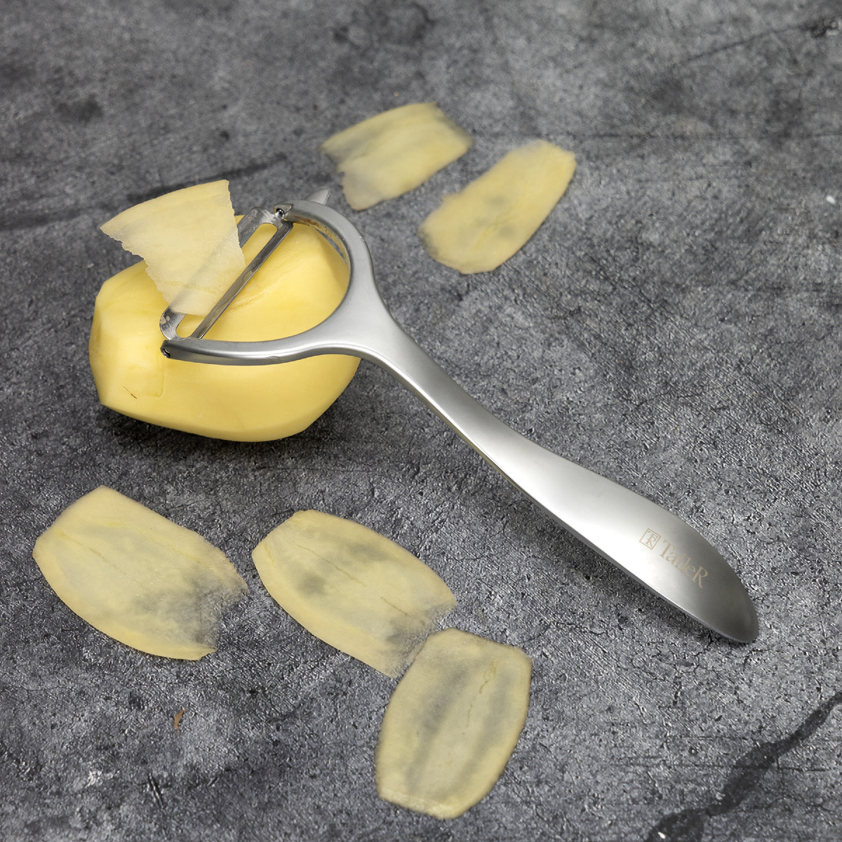 Овощечистка TalleR успешно подойдет как правой, так и левой руке, что делает её универсальным инструментом для каждого на кухне. Благодаря плавающему двухстороннему лезвию, с этой овощечисткой можно легко очищать продукты как на себя, так и от себя.