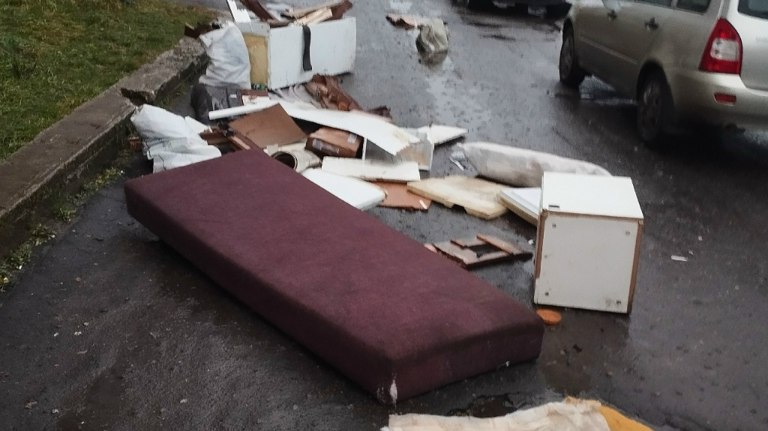 Местные жители уверяют, что мусор во время вывоза растеряла компания-перевозчик. Теперь по двору невозможно ни проехать, ни пройти.