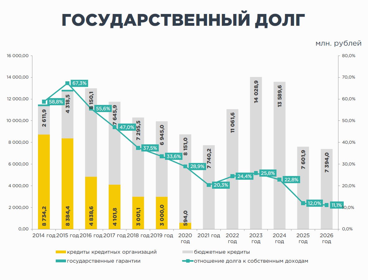 ГОСДОЛГ уменьшается на 5,8 млрд. рублей, в т.ч. за счет списания 2/3 задолженности по бюджетным кредитам, и составит на 1 января 2026 года7,6 млрд. рублей, или 12,1% от планового объема доходов.