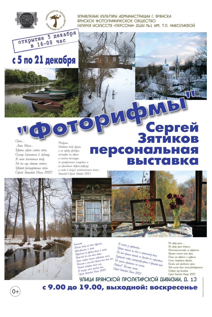 В Брянске 5 декабря в галерее «Персона» ДШИ №1 им. Т.П. Николаевой откроется персональная выставка работ фотографа Сергея Зятикова. Экспозиция называется «Фоторифмы». Открытие запланировано на 16.00