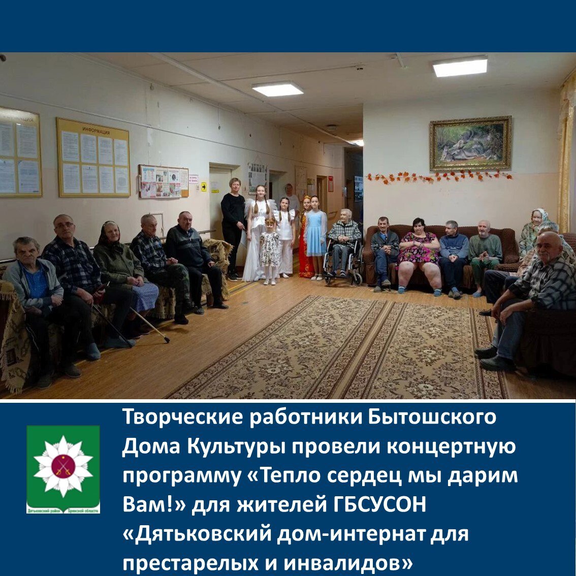 Творческие работники Бытошского Дома Культуры провели концертную программу «Тепло сердец мы дарим Вам!» для жителей ГБСУСОН «Дятьковский дом-интернат для престарелых и инвалидов»