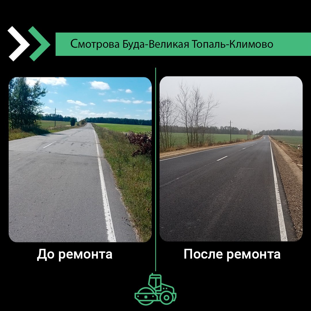 В Клинцовском районе Брянской области в рамках национального проекта «Инфраструктура для жизни» отремонтирован участок автодороги Смотрова Буда – Великая Топаль – Климово, протяжённостью 9,5 км. Работы выполнила подрядная организация ООО «Погарагродорстрой». В ходе ремонта было уложено новое асфальтобетонное покрытие, укреплены обочины, а также отремонтированы пересечения и примыкания. На завершающем этапе на обновлённом участке нанесена разметка.