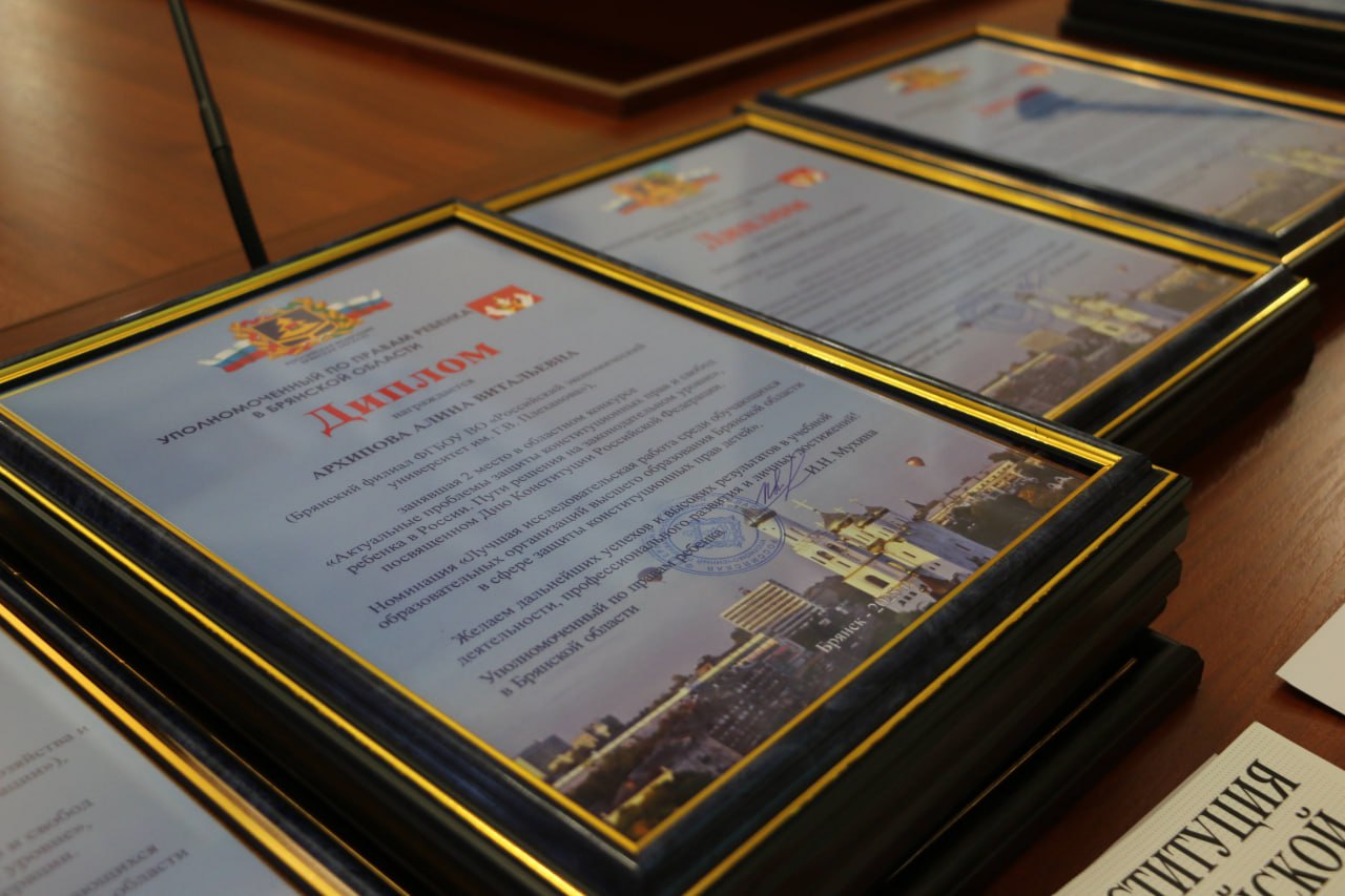 В Брянской областной Думе наградили победителей тематического конкурса исследовательских работ ко Дню Конституции, организованного Уполномоченным по правам ребенка в регионе Инной Мухиной.