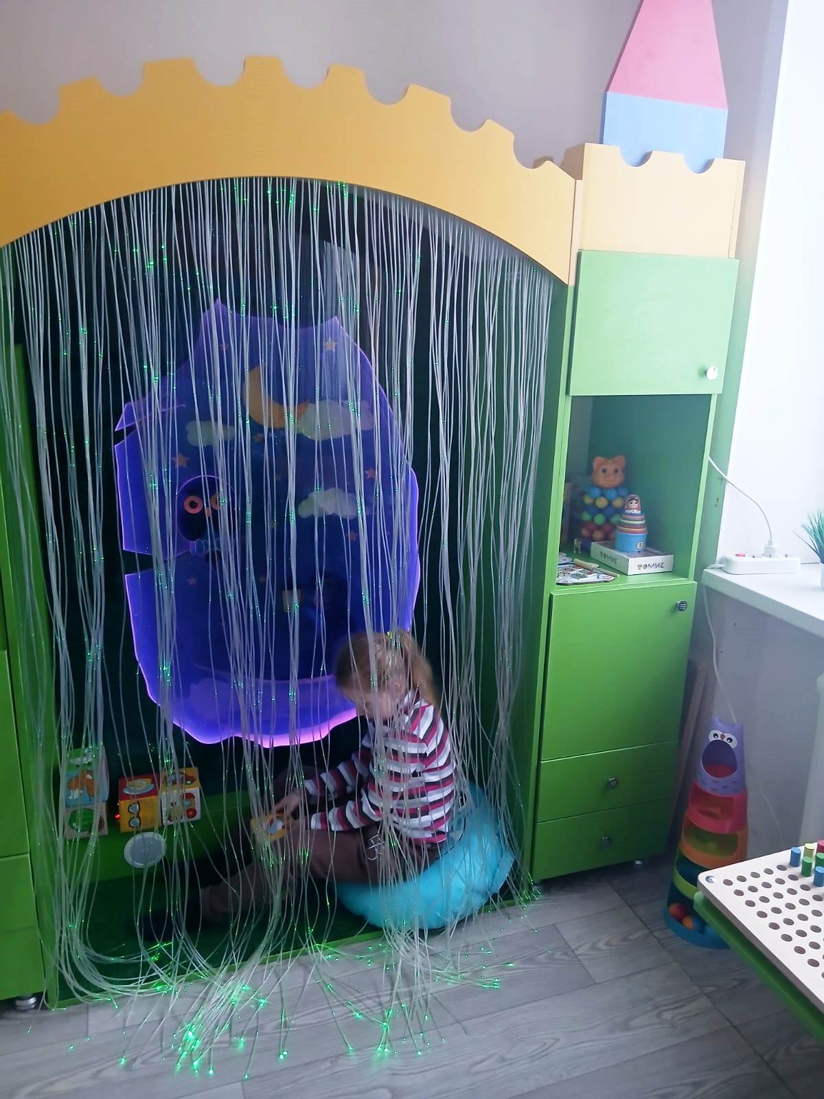 Модуль «Волшебная комната» привлекает внимание своей необычной структурой: внутренний интерьер дополнен фибероптическим сухим душем и стилизованной задней панелью с мягким свечением. Но самое главное достоинство пространства — это специальный уголок отдыха, оснащённый успокаивающей системой LED-подсветки и созданный специально для расслабления и коррекции эмоционального состояния ребенка.
