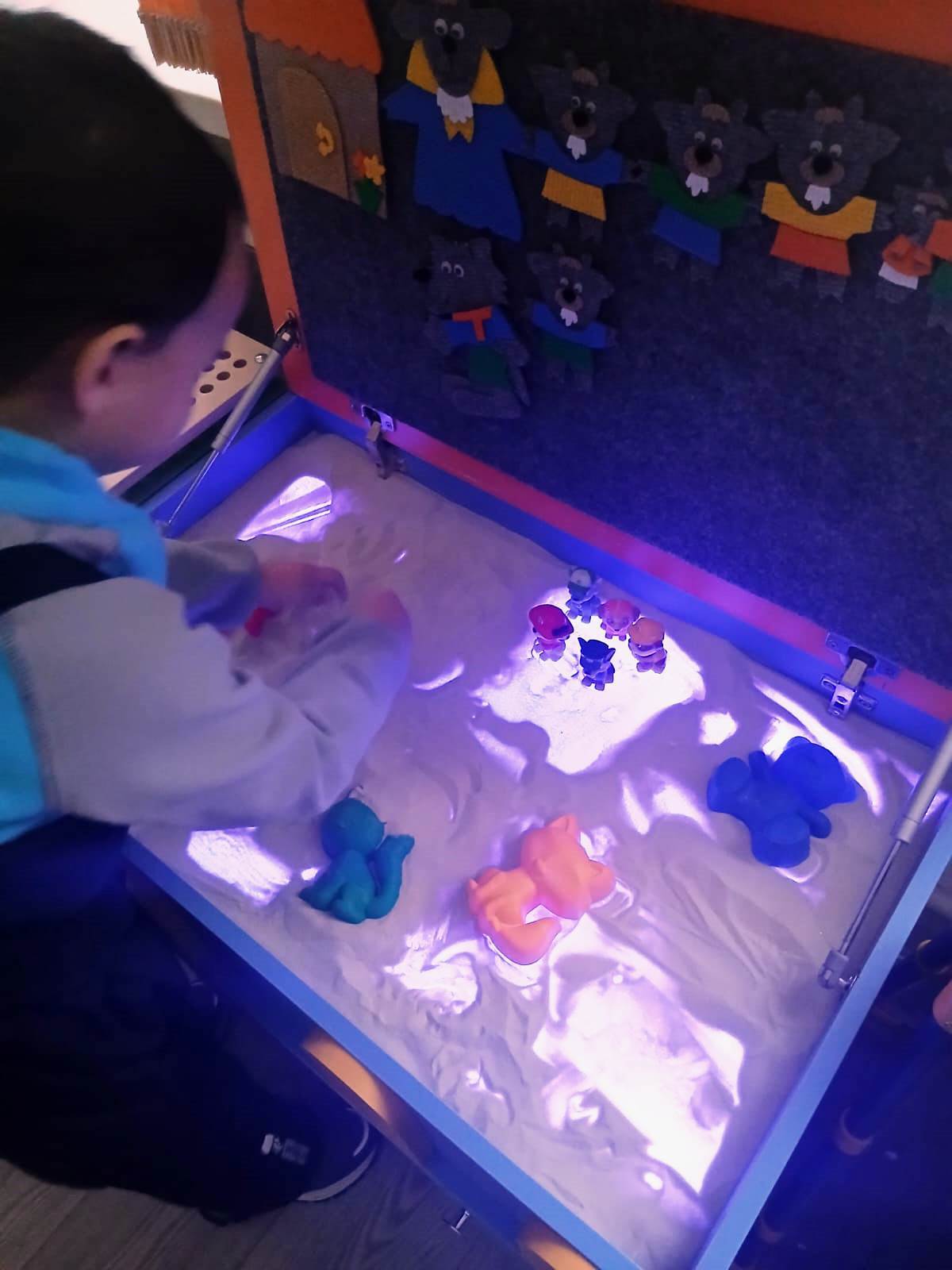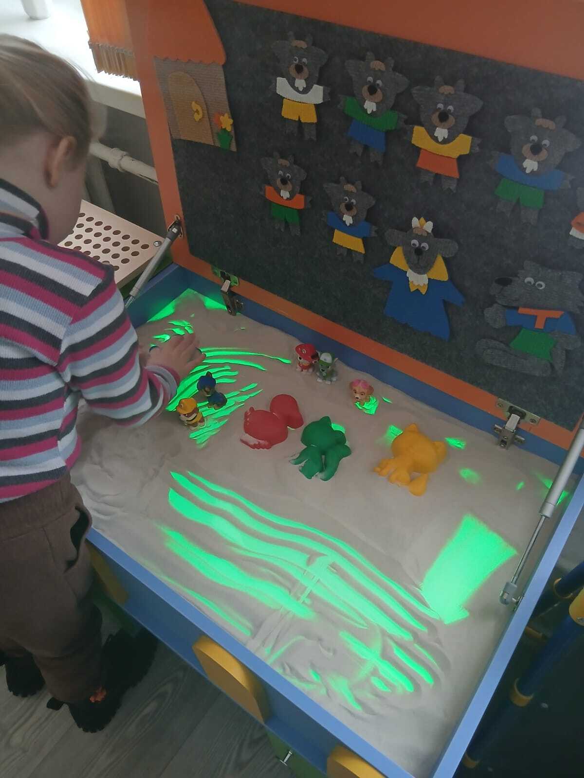 Комплекс оснащен современным оборудованием для проведения различных видов развивающих занятий, включая популярную среди малышей песочную терапию с использованием качественного кварцевого и кинетического песка. Особенность рабочей зоны состоит в наличии световой RGB-подсветки, позволяющей регулировать интенсивность света и оттенок, создавая атмосферу сказки и вдохновения.