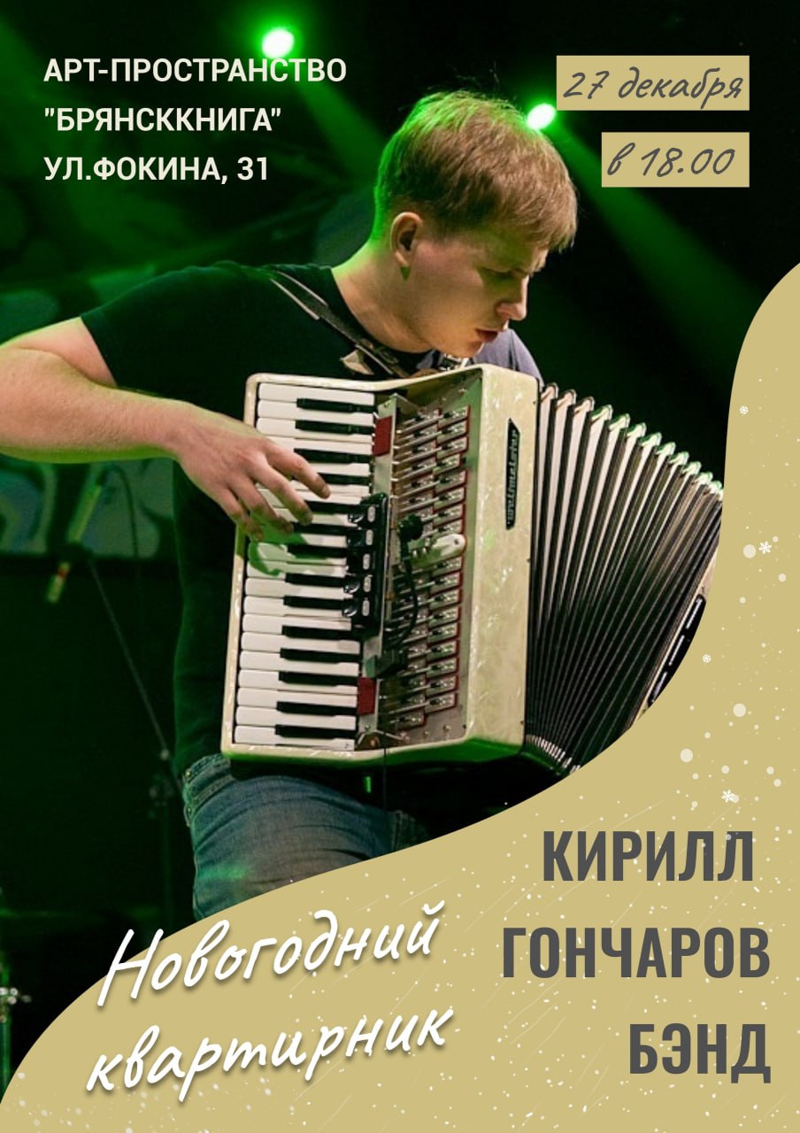 Арт-пространство «Брянсккнига» предлагает завершить 2025 год в теплой компании с хорошей музыкой. На новогоднем квартирнике 27 декабря выступит «Кирилл Гончаров band». Гости услышат профессиональное исполнение авторских композиций.