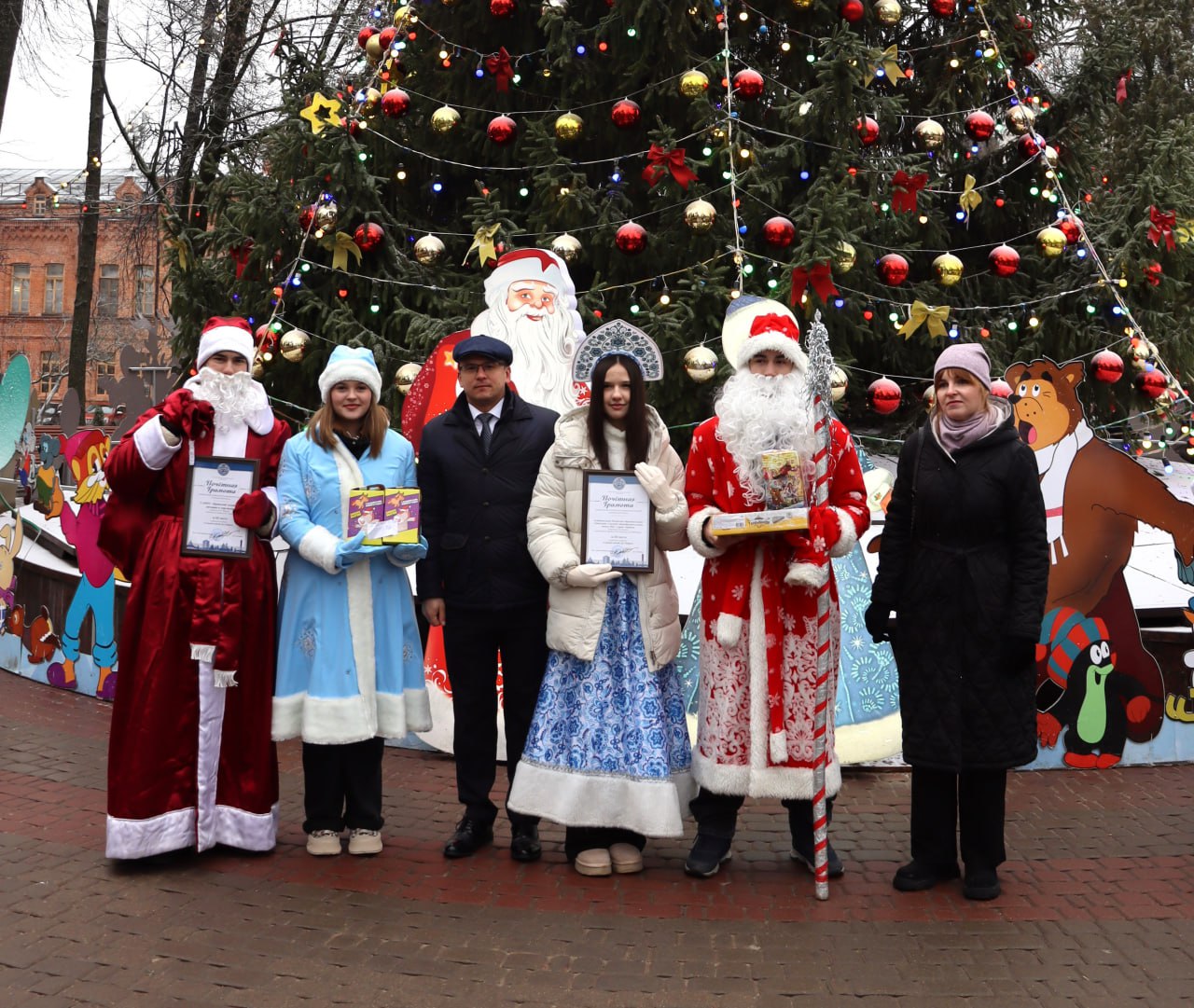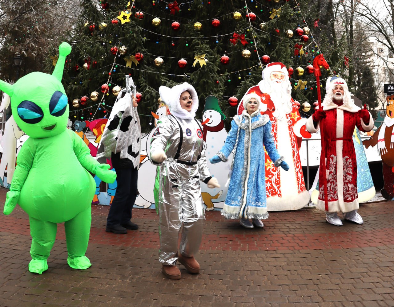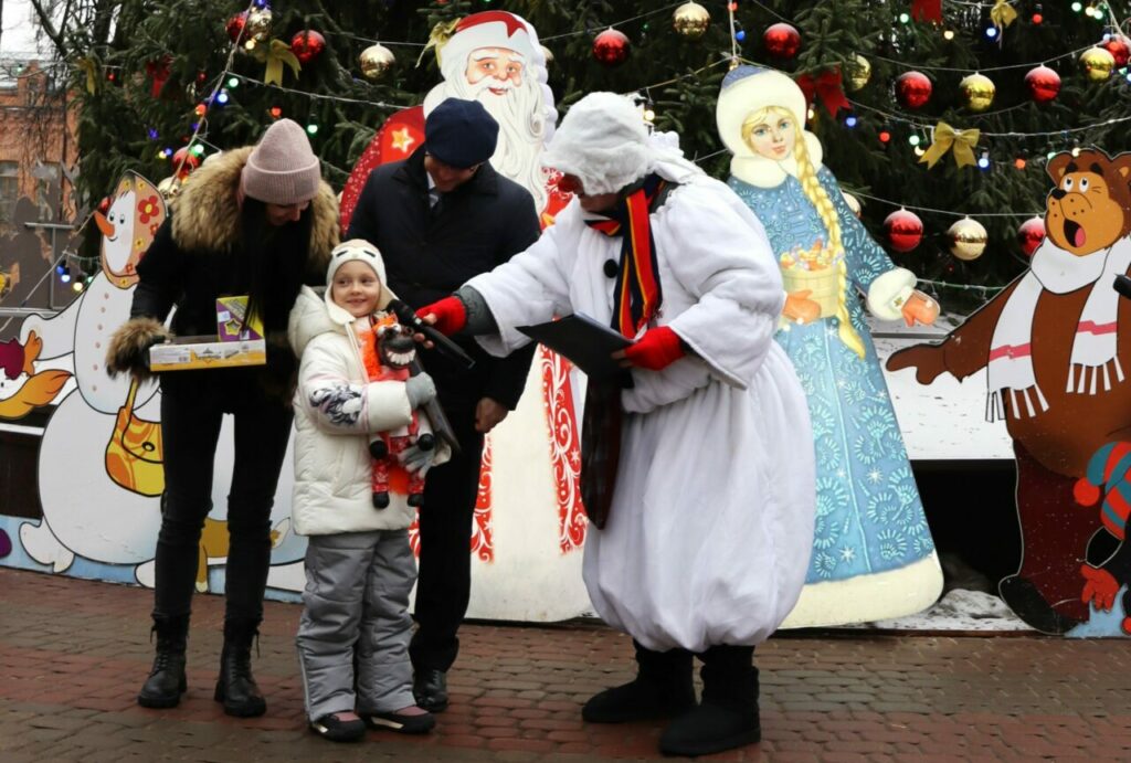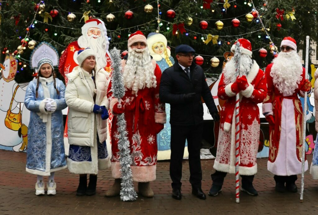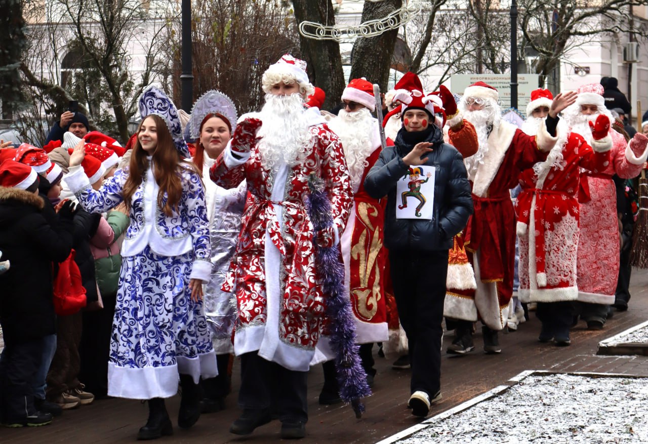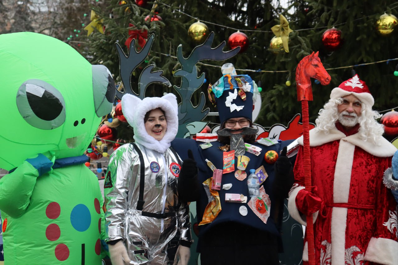Торжественное мероприятие открыл традиционный парад Дедов Морозов и Снегурочек. Ежегодно в нём принимают участие школьники и студенты. Здесь же наградили грамотами и сладкими подарками победителей конкурса ёлочной игрушки.