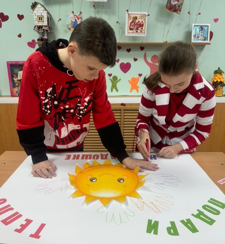 Внутри каждого из нас есть добро, мы можем выразить его делами, поступками, улыбкой. Педагоги провели беседу с ребятами о том, что такое доброта, милосердие. И решили сделать стенгазету "Подари тепло на ладошке".