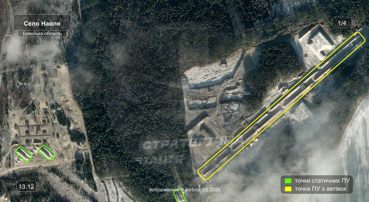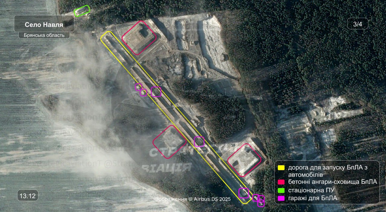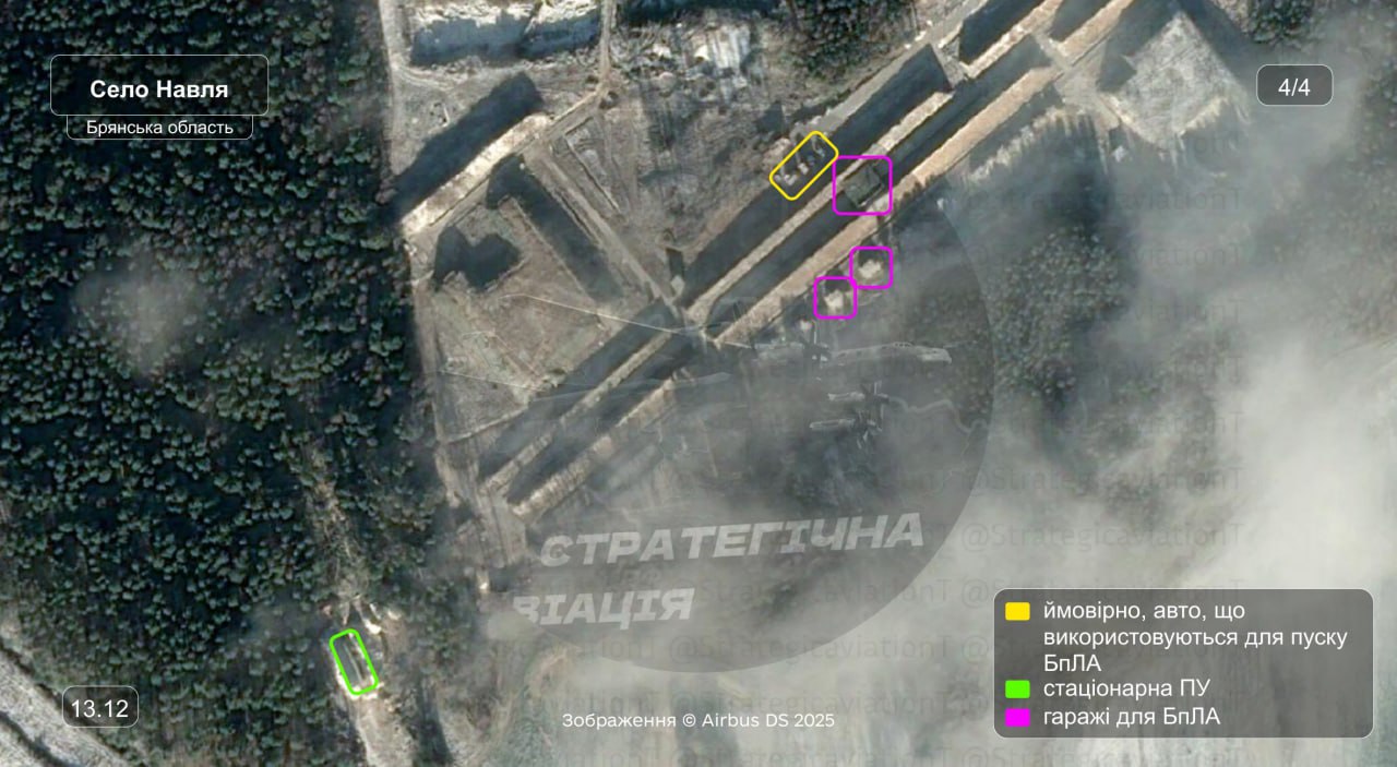 На расстоянии примерно 70 км от границы в Брянской области была оборудована площадка для запуска Гераней. На спутниковых снимках можно увидеть стационарные пусковые установки, места хранения беспилотников и другие характерные строения.