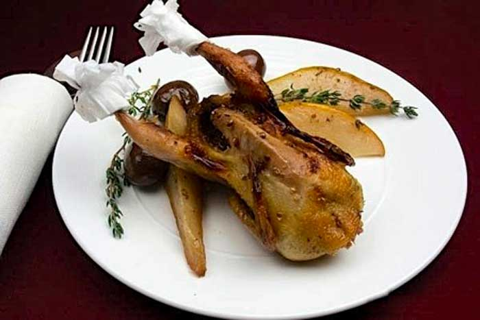 По истечении этого времени крышка снимается, и температура в духовке повышается до 200°C. Перепелки запекаются еще 20 минут до появления золотистой корочки. Готовые перепелки выкладываются на сервировочное блюдо, рядом размещаются дольки груш. Это великолепное блюдо станет настоящим украшением любого стола и оставит незабываемое впечатление у ваших гостей.