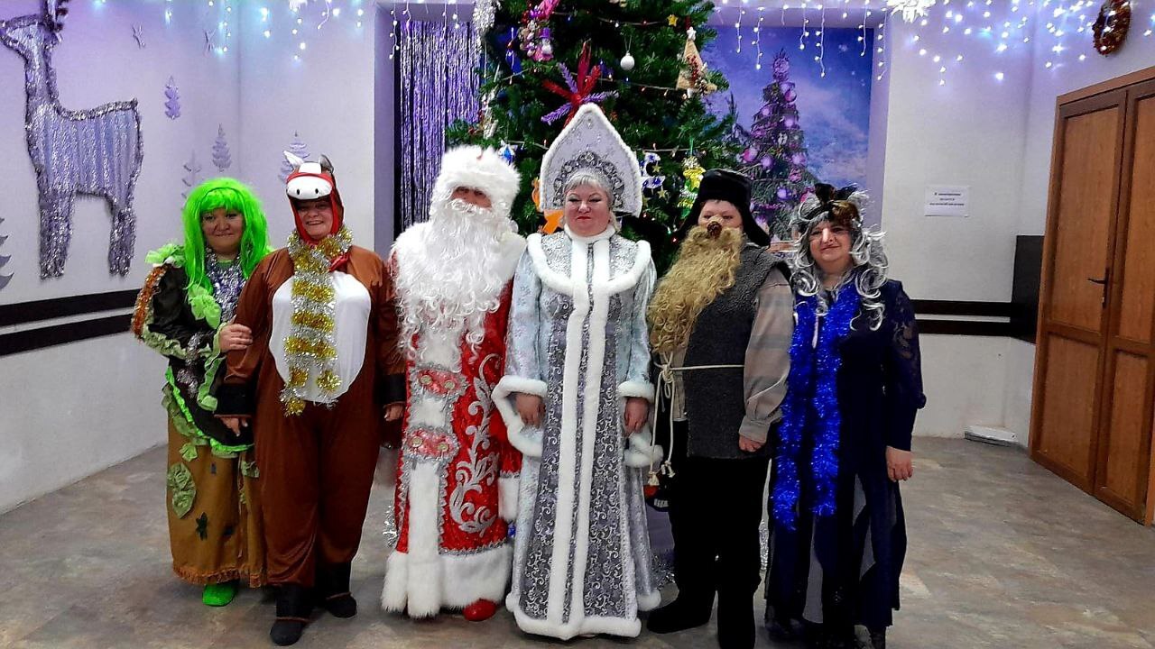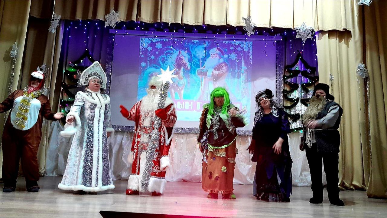 Коллектив РДК подготовил волшебное, театрализованное представление: "Как Дед Мороз и Снегурочка в лесу потерялись". У входа в ДК ребят встречала веселая мишка Ляля( А. Семина). Сказочные персонажи- Баба Яга (Г.Фатова), Кикимора(Г.Лягина), Леший ( Н.Семенец), как всегда, пытались испортить праздник.