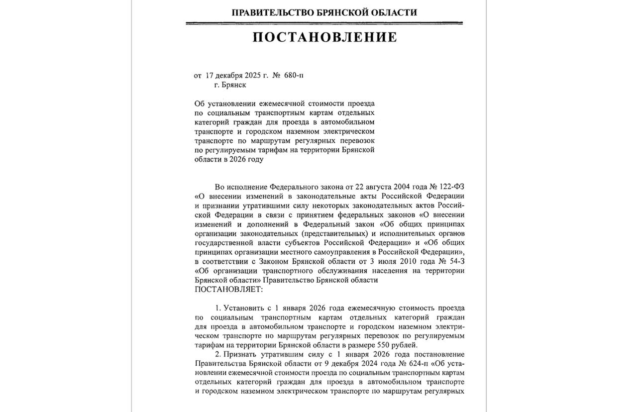 Правительство Брянской области утвердило стоимость проезда по социальным транспортным картам на 2026 год.