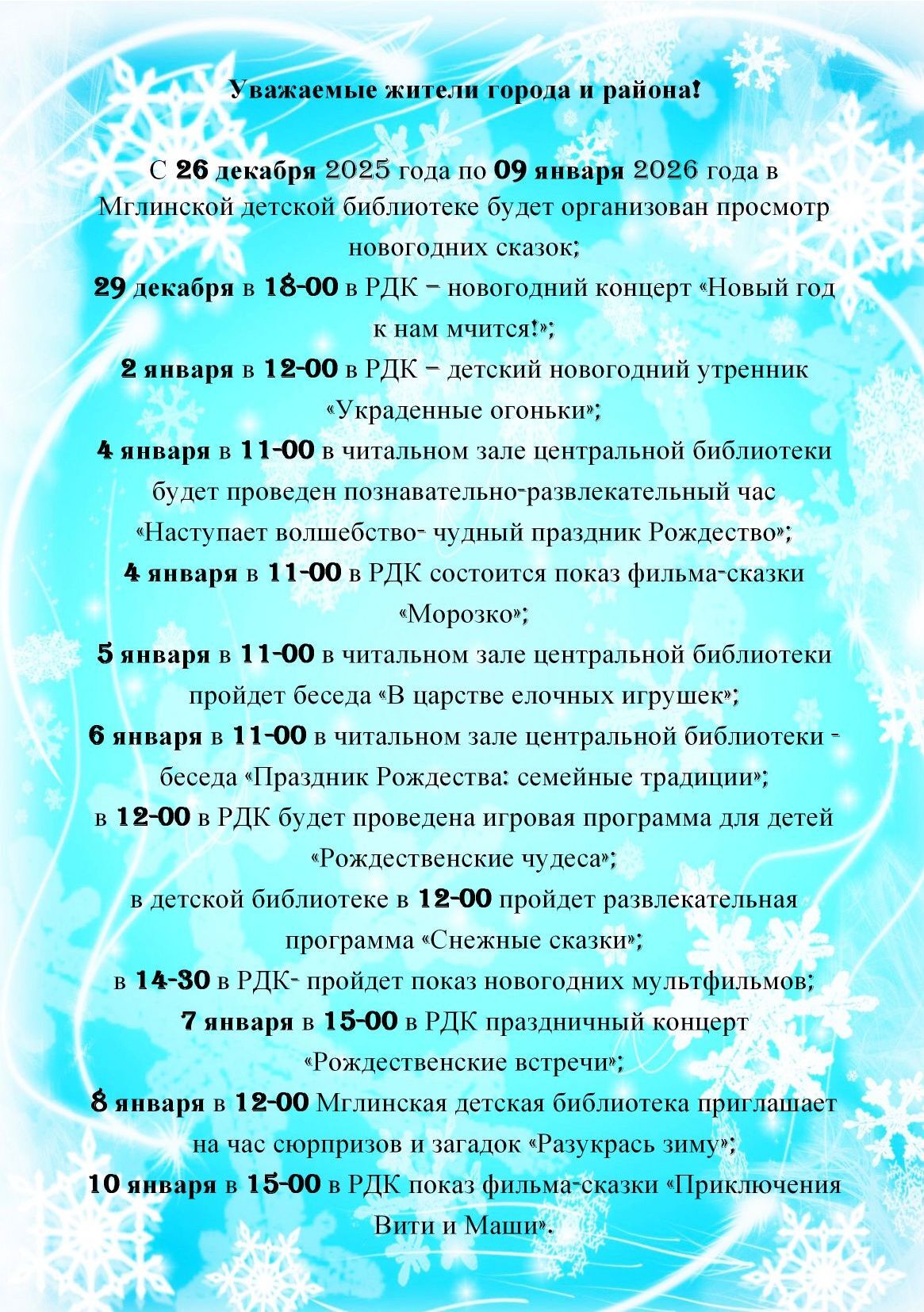 Анонс новогодних мероприятий с 26 декабря по 10 января.