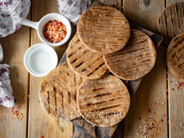 Предварительно разогрейте сковороду-гриль или обыкновенную с антипригарным покрытием, немного смазав её растительным маслом. Выложите заготовки и жарьте на среднем огне. Следите за тем, чтобы лепёшки подрумянились с обеих сторон. Если сковорода разогрета слишком сильно, они могут подгореть снаружи, оставаясь сырыми внутри.
