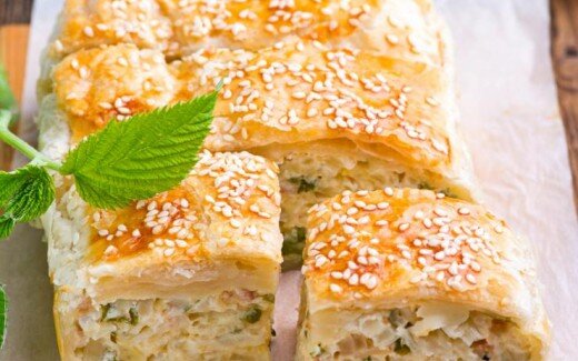- Распределите начинку по тесту, заверните свисающие края и посыпьте кунжутом.