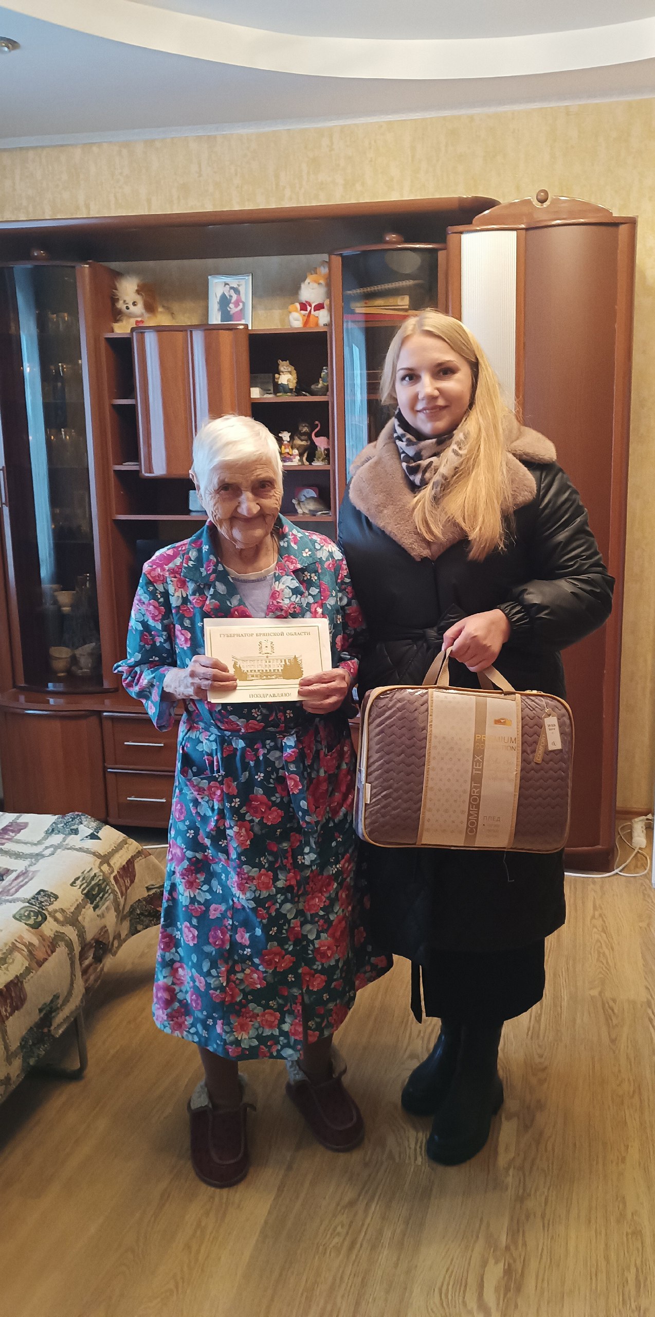 Юбиляра поздравила заведующая отделением срочного социального обслуживания и консультативной помощи ГБУ КЦСОН Брянского района В.А.Зинакова, которая вручила Пелагее Сергеевне персональные поздравления Президента Российской Федерации В.В.Путина, Губернатора Брянской области А.В.Богомаза, а также поздравление главы администрации Брянского района А.А.Пронина и главы Брянского муниципального района Д.Л.Евича и памятный подарок.