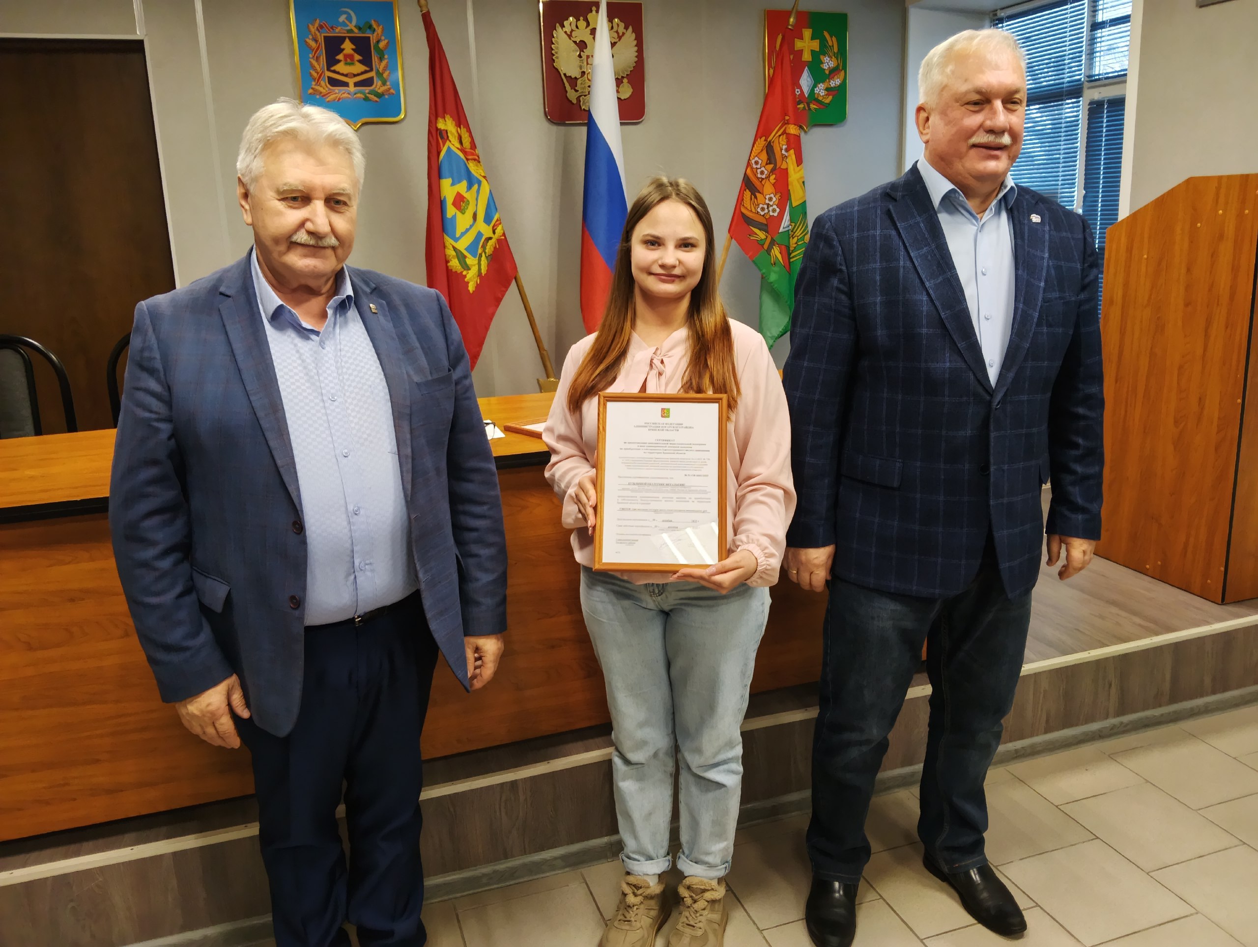 Вместе с главой Погарского района Геннадием Гунарем вручили сертификаты двум сиротам Кузьминой Екатерине и Гераськовой Вере.
