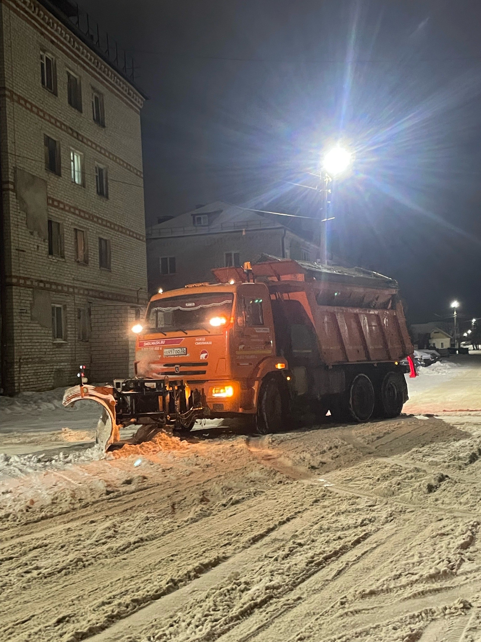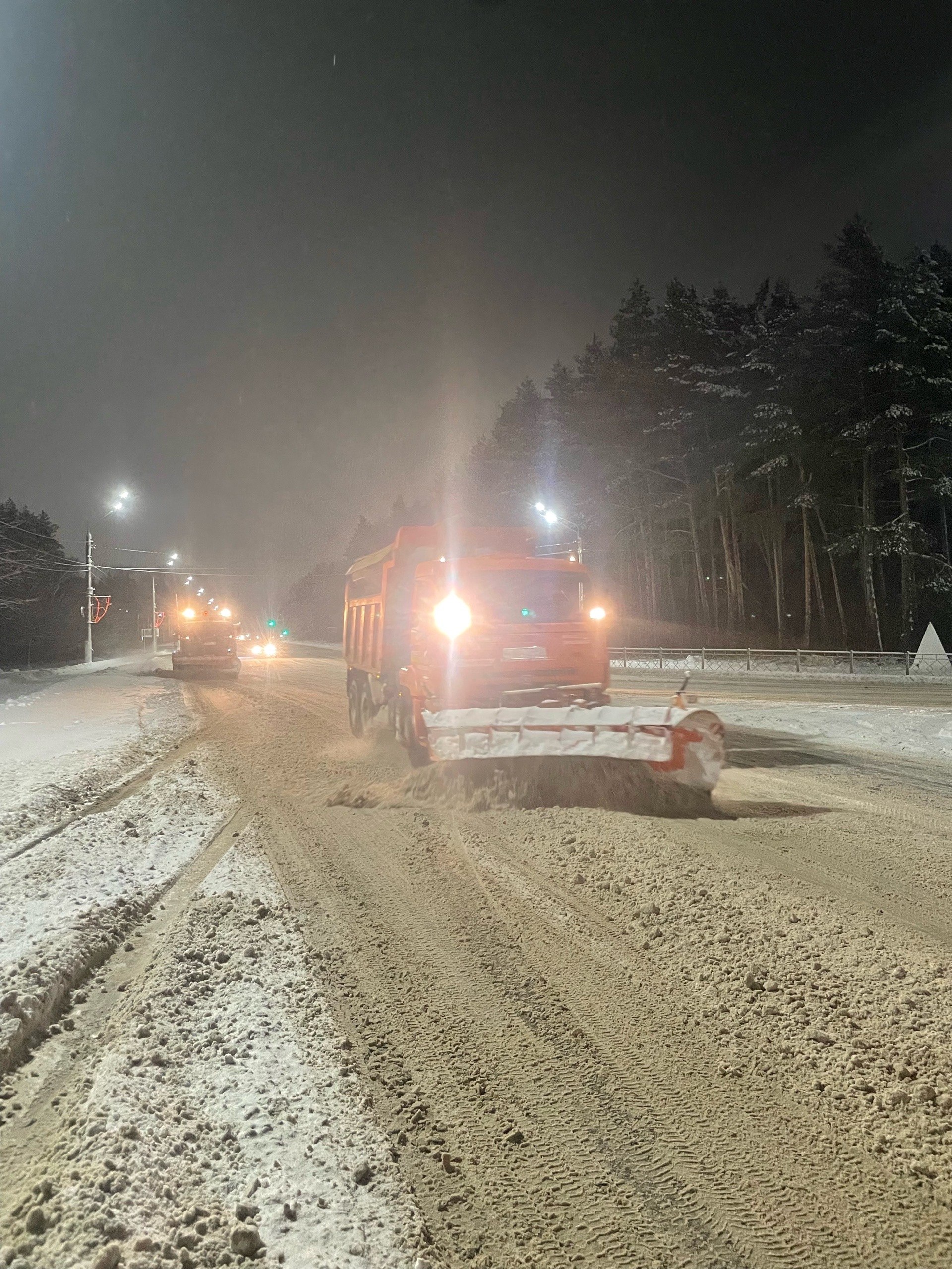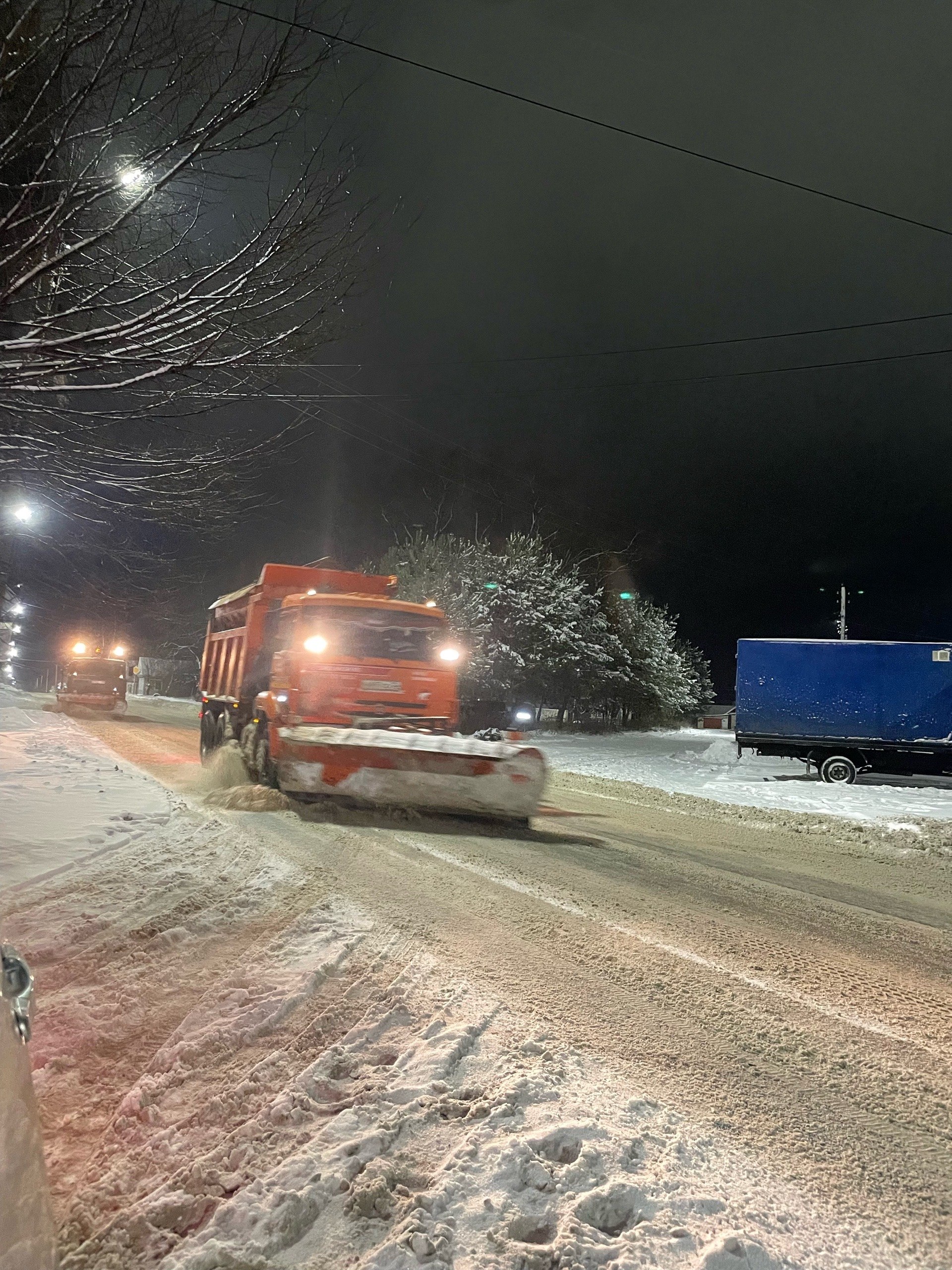 29.12. ночью сотрудники МБУ «Благоустройство» и 4 КДМ расчищали дороги от снега. Также выполнили подсыпку дорог пескосоляной смесью.