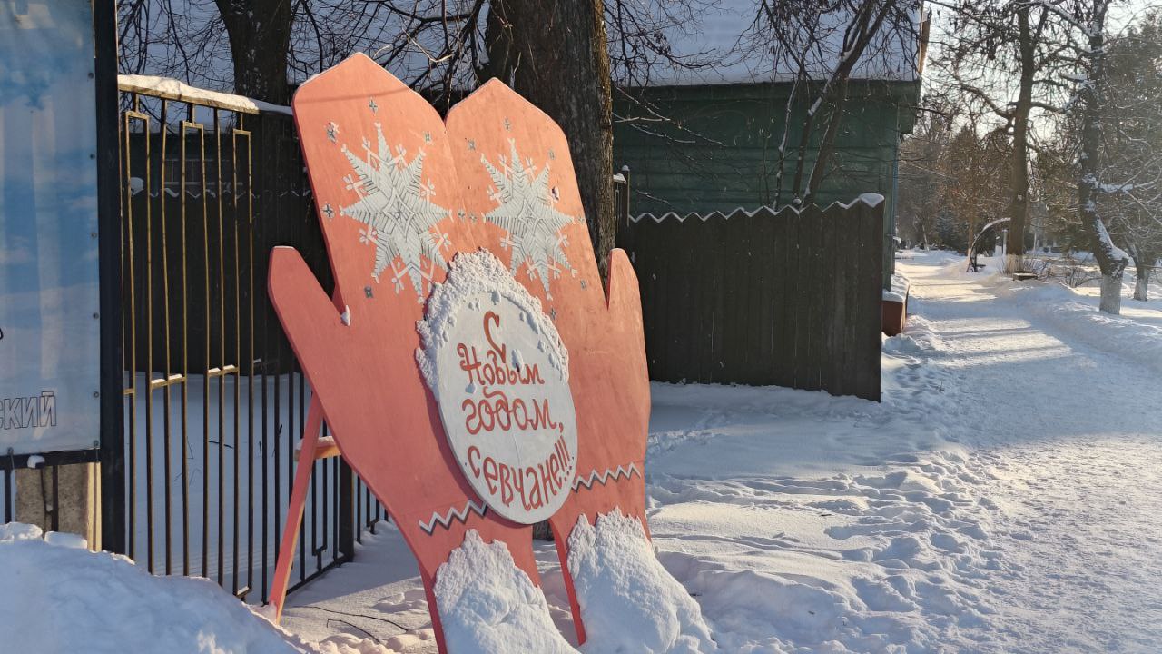 Так, в рождественский Сочельник в Севске горожане прогуливаются по центру города, делают снимки около ярко наряженных елей, инсталляция с поздравлением в виде варежек.
