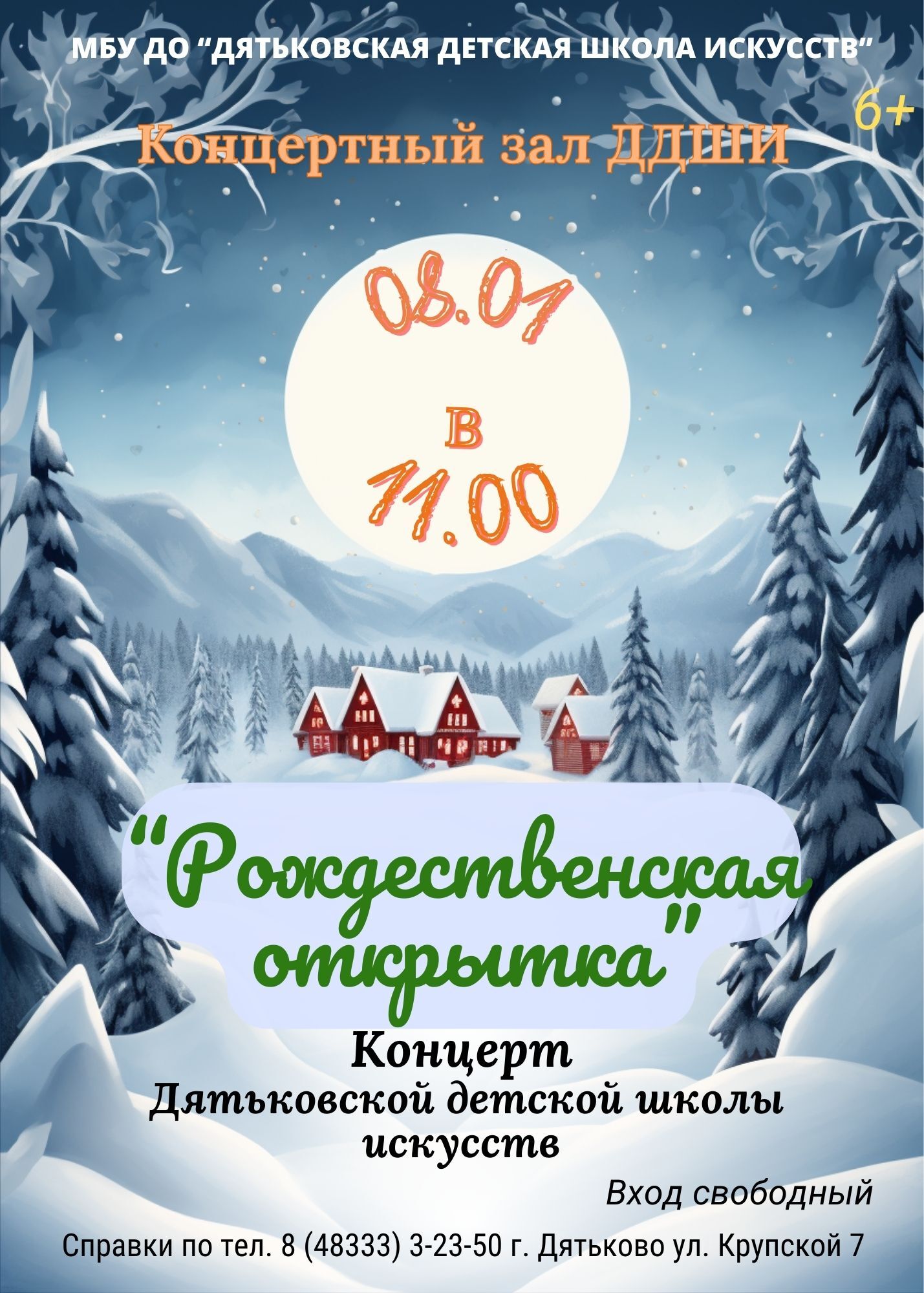 Приглашаем вас 8 января 2026 года, на концерт обучающихся и преподавателей Дятьковской детской школы искусств «Рождественская открытка»!