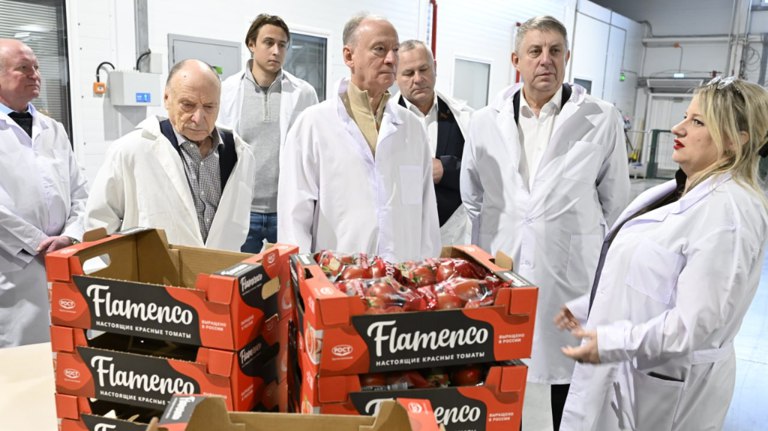Николай Патрушев вместе с губернатором Александром Богомазом посетил тепличный комбинат «Журиничи». На предприятии применяется преимущественно ручной труд на всех этапах — от посева до сбора урожая, при этом контроль производственных процессов осуществляется специалистами, несмотря на высокий уровень автоматизации.