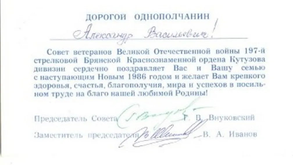 В сети хранится новогодняя открытка от Совета ветеранов Великой Отечественной войны 197 стрелковой Брянской Краснознаменной ордена Кутузова дивизии. Поздравление адресовано однополчанину.