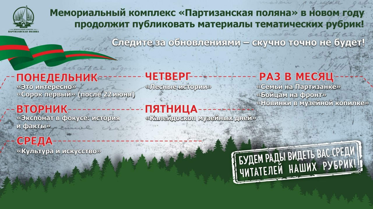 А начнём вот с чего: в 2026 году Мемориальный комплекс «Партизанская поляна» продолжит публиковать материалы полюбившихся вам тематических рубрик, но не только – круг тем расширится!