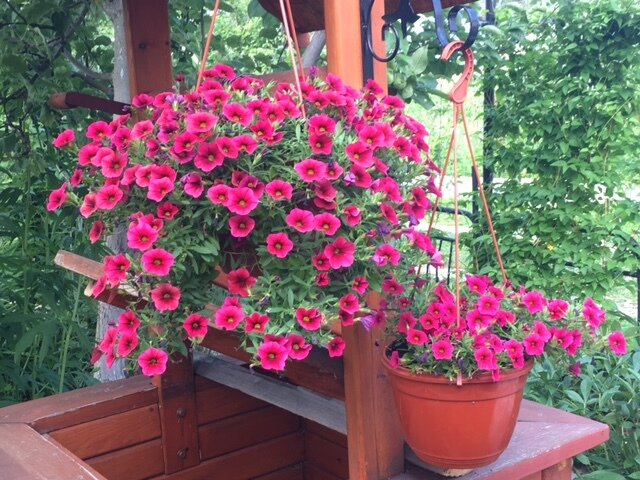 Когда наступила середина лета, калибрахоа распустила свои цветы с невыразимой щедростью. Массированные ветви дружно покрыли кашпо словно ярким ковром, привлекшим внимание всех любителей цветочного творчества.