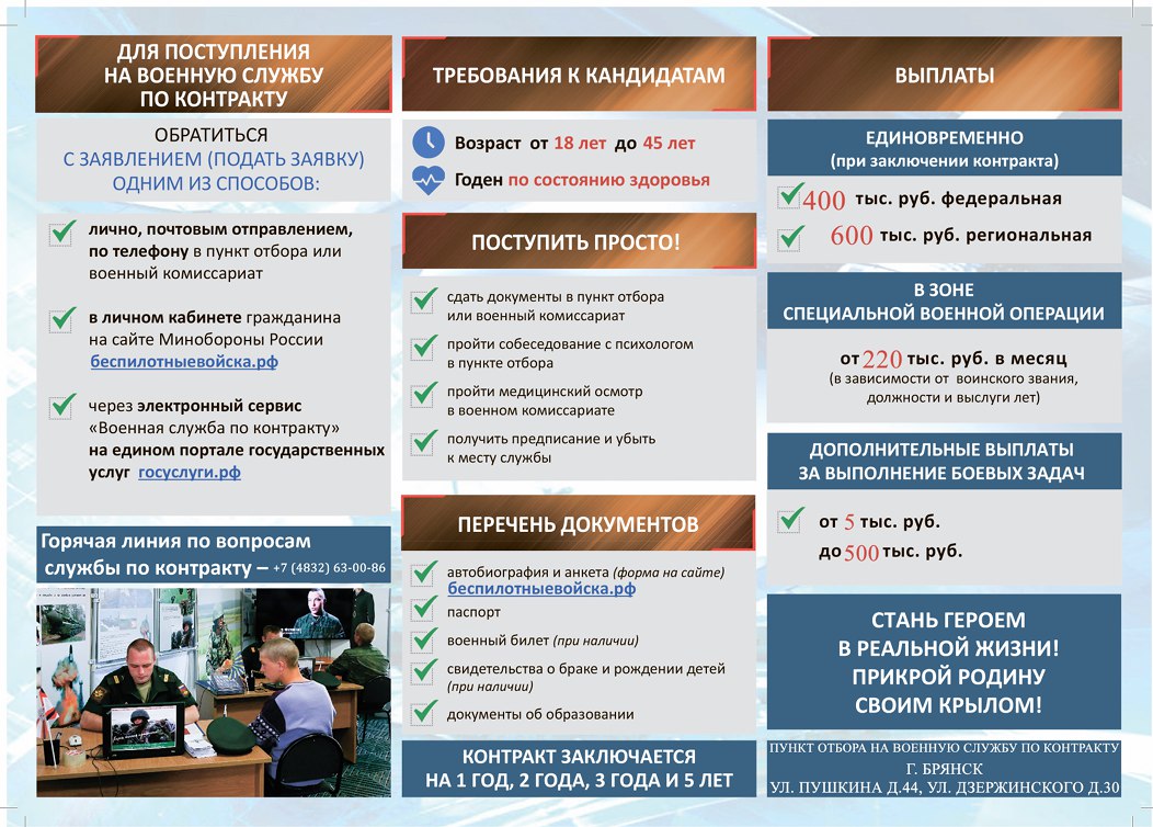 Либо в Пункт отбора на военную службу по контракту (2 разряда) г. Брянск ул. Пушкина 44, 89651194474 Денис Дмитриевич.