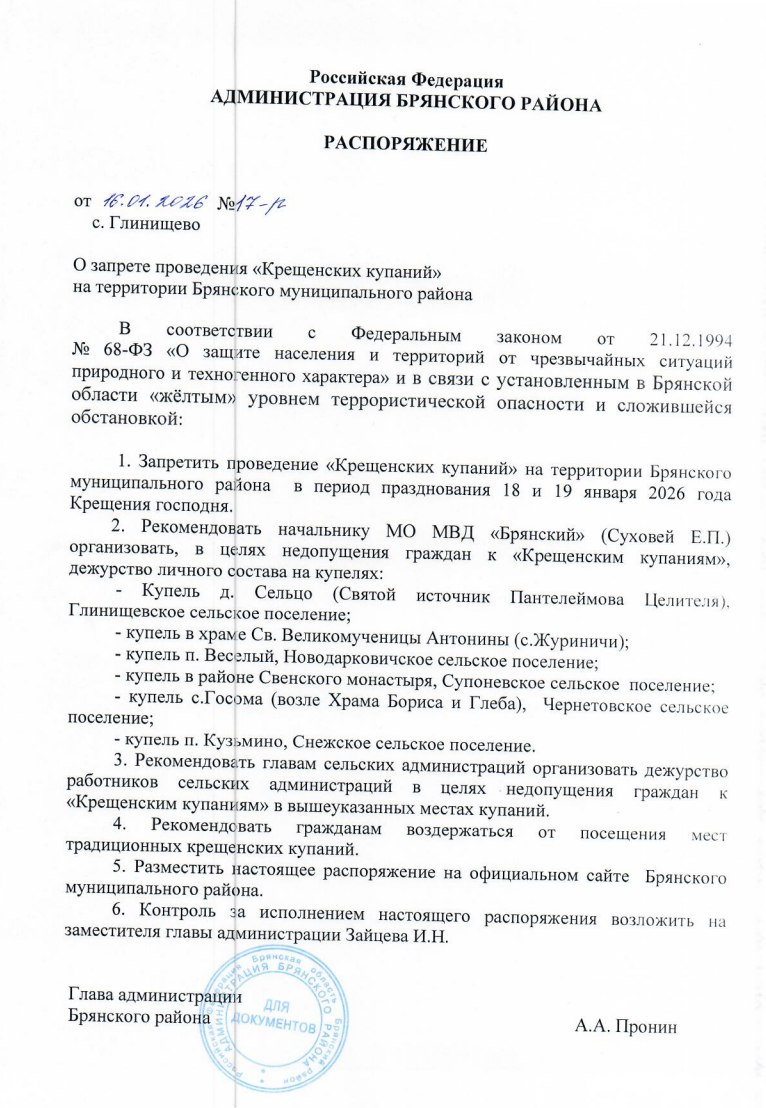 На территории Брянского муниципального района запрещается проведение «Крещенских купаний» в период празднования 18 и 19 января 2026 года Крещения Господня в связи с установленным в Брянской области «жёлтым» уровнем террористической опасности и сложившейся обстановкой, а также в соответствии с Федеральным законом от 21.12.1994 № 68-ФЗ «О защите населения и территорий от чрезвычайных ситуаций природного и техногенного характера».